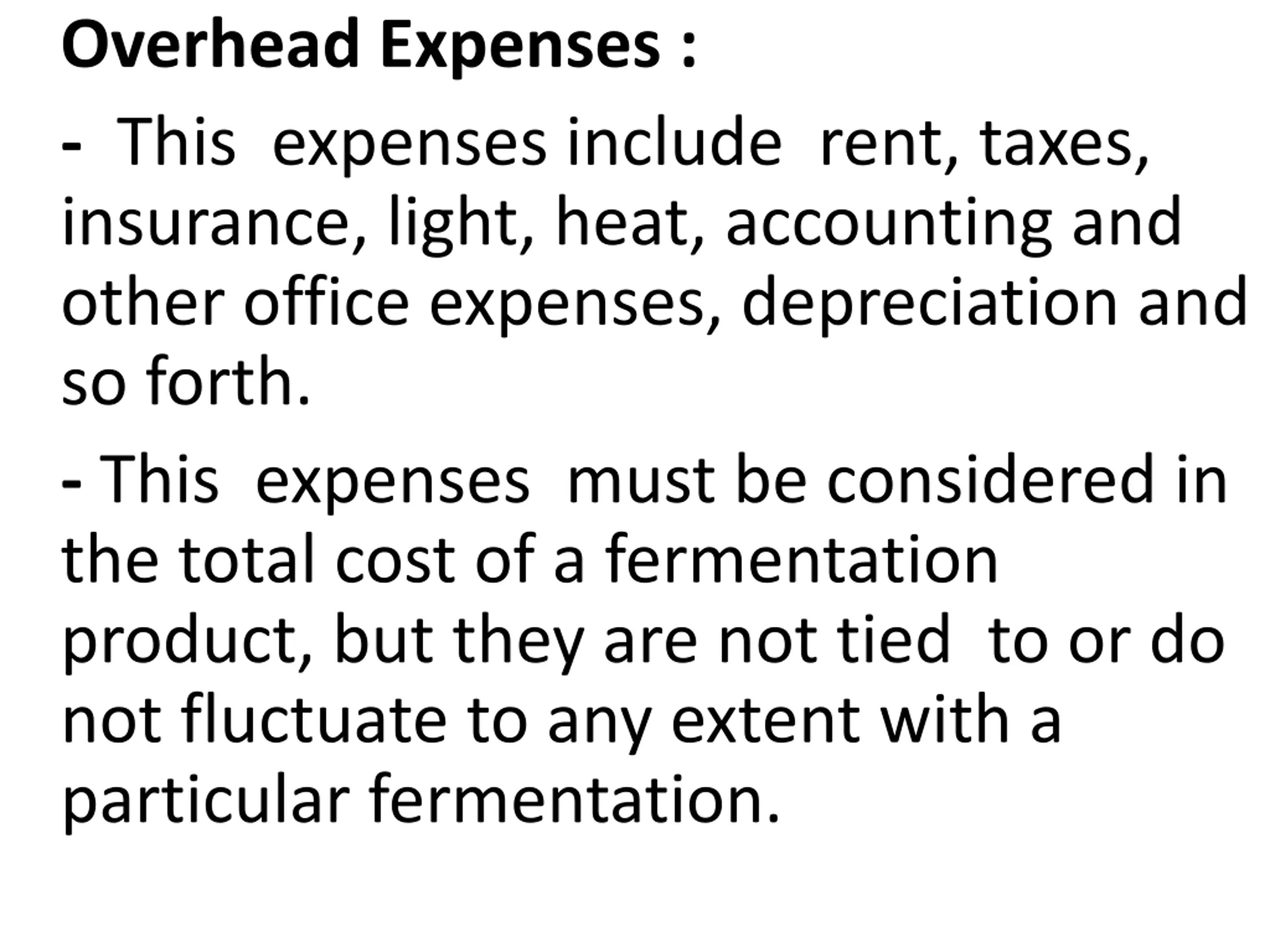 Overhead Expenses : - This expenses include rent, taxes, insurance, light, heat, accounting and other office expenses, depreciation and so forth. - This expenses must be considered in the total cost of a fermentation product, but they are not tied to or do not fluctuate to any extent with a particular fermentation.