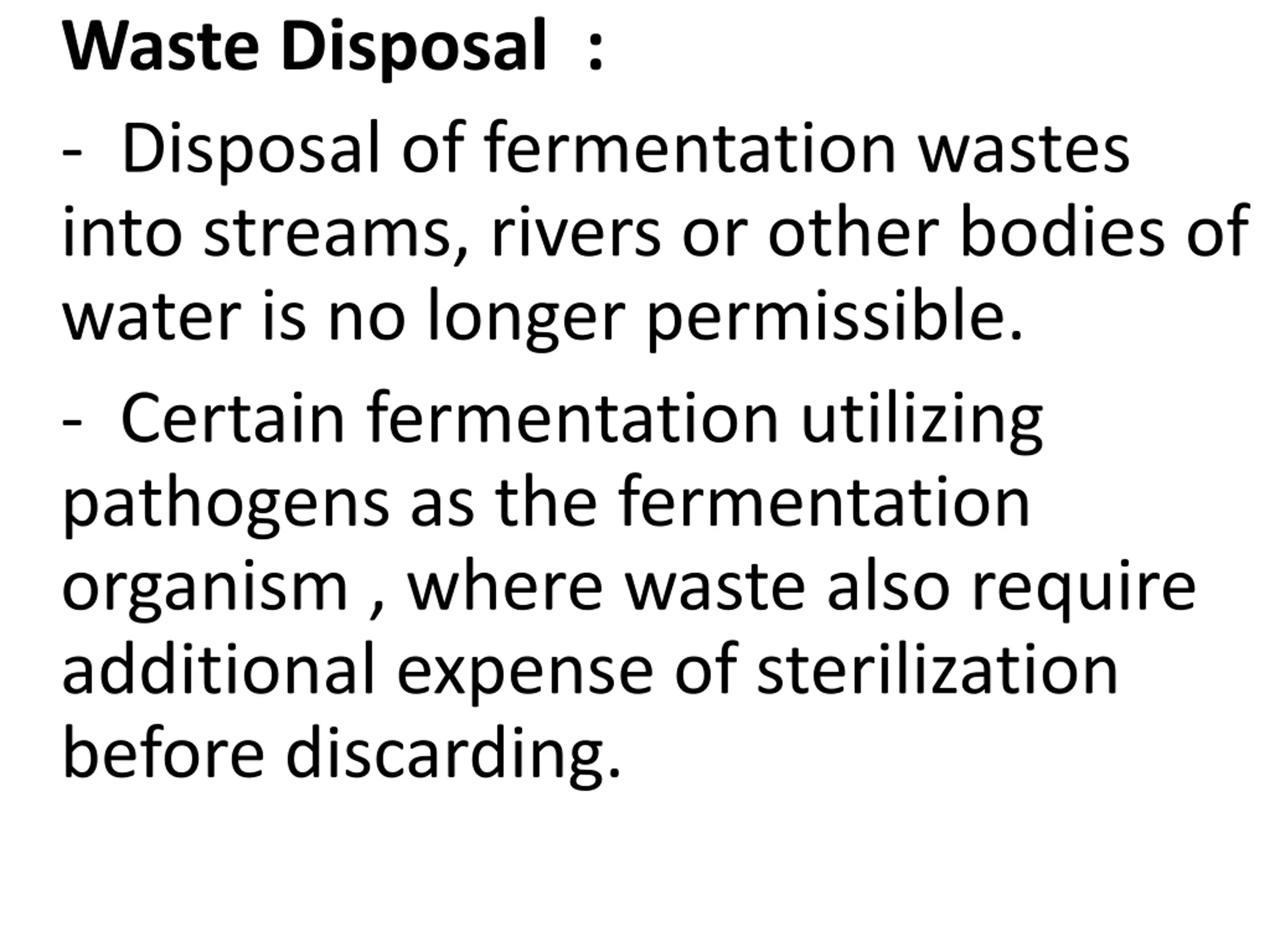 Waste Disposal : - Disposal of fermentation wastes into streams, rivers or other bodies of water is no longer permissible. - Certain fermentation utilizing pathogens as the fermentation organism , where waste also require additional expense of sterilization before discarding.