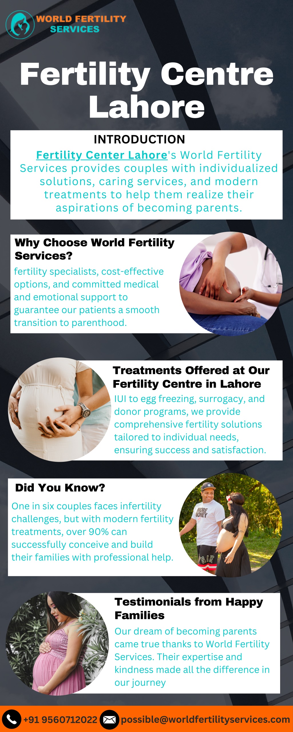 Fertility Centre Lahore INTRODUCTION Fertility Center Lahore's World Fertility Services provides couples with individualized solutions, caring services, and modern treatments to help them realize their aspirations of becoming parents. Why Choose World Fertility Services? fertility specialists, cost-effective options, and committed medical and emotional support to guarantee our patients a smooth transition to parenthood. Treatments Offered at Our Fertility Centre in Lahore IUI to egg freezing, surrogacy, and donor programs, we provide comprehensive fertility solutions tailored to individual needs, ensuring success and satisfaction. Did You Know? One in six couples faces infertility challenges, but with modern fertility treatments, over 90% can successfully conceive and build their families with professional help. Testimonials from Happy Families Our dream of becoming parents came true thanks to World Fertility Services. Their expertise and kindness made all the difference in our journey possible@worldfertilityservices.com +91 9560712022