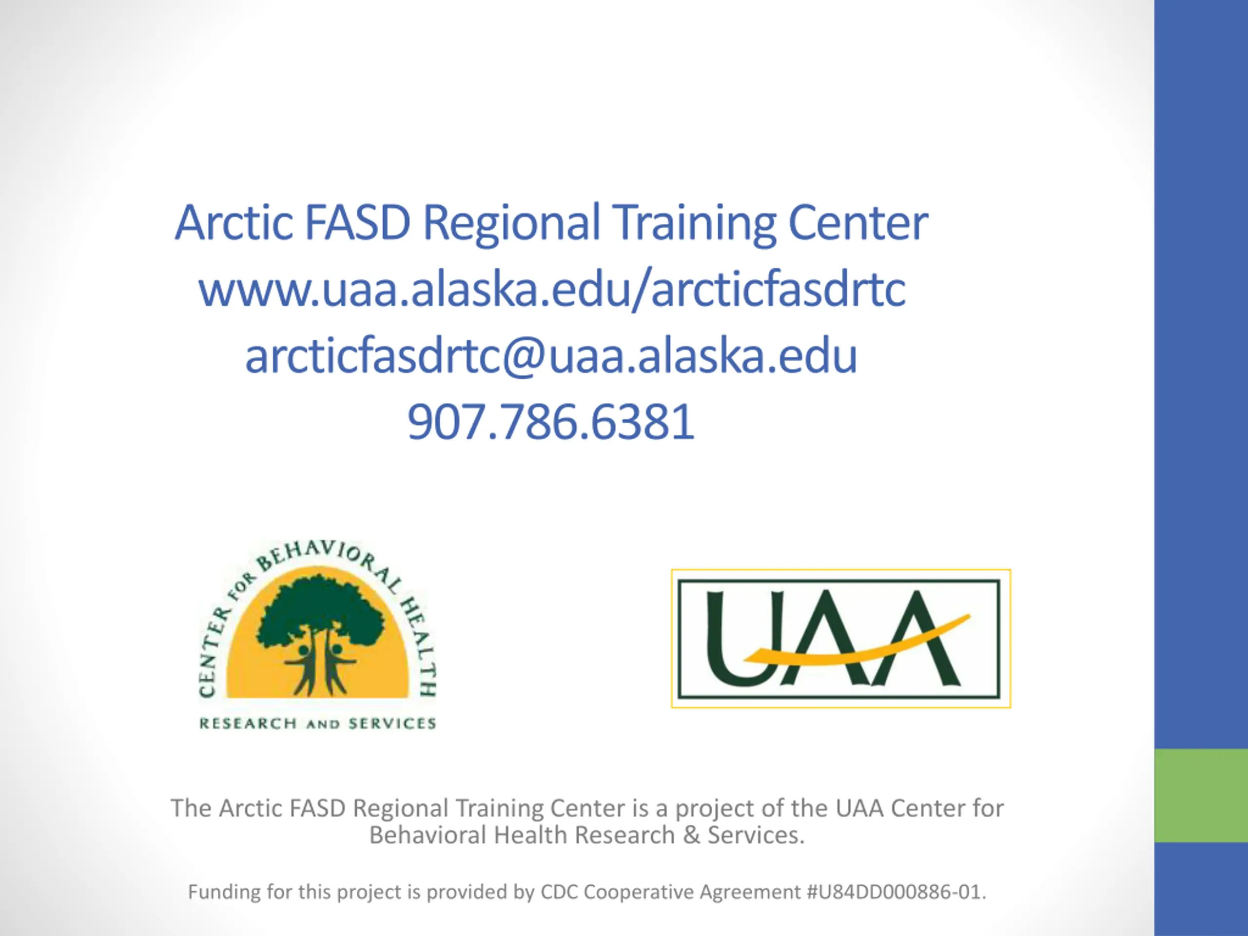 Fetal Alcohol Spectrum Disorders: Competency I -Foundation The Arctic FASD Regional Training Center is a project of the UAA Center for Behavioral Health Research & Services. Funding for this project is provided by CDC Cooperative Agreement #U84DD000886-01.