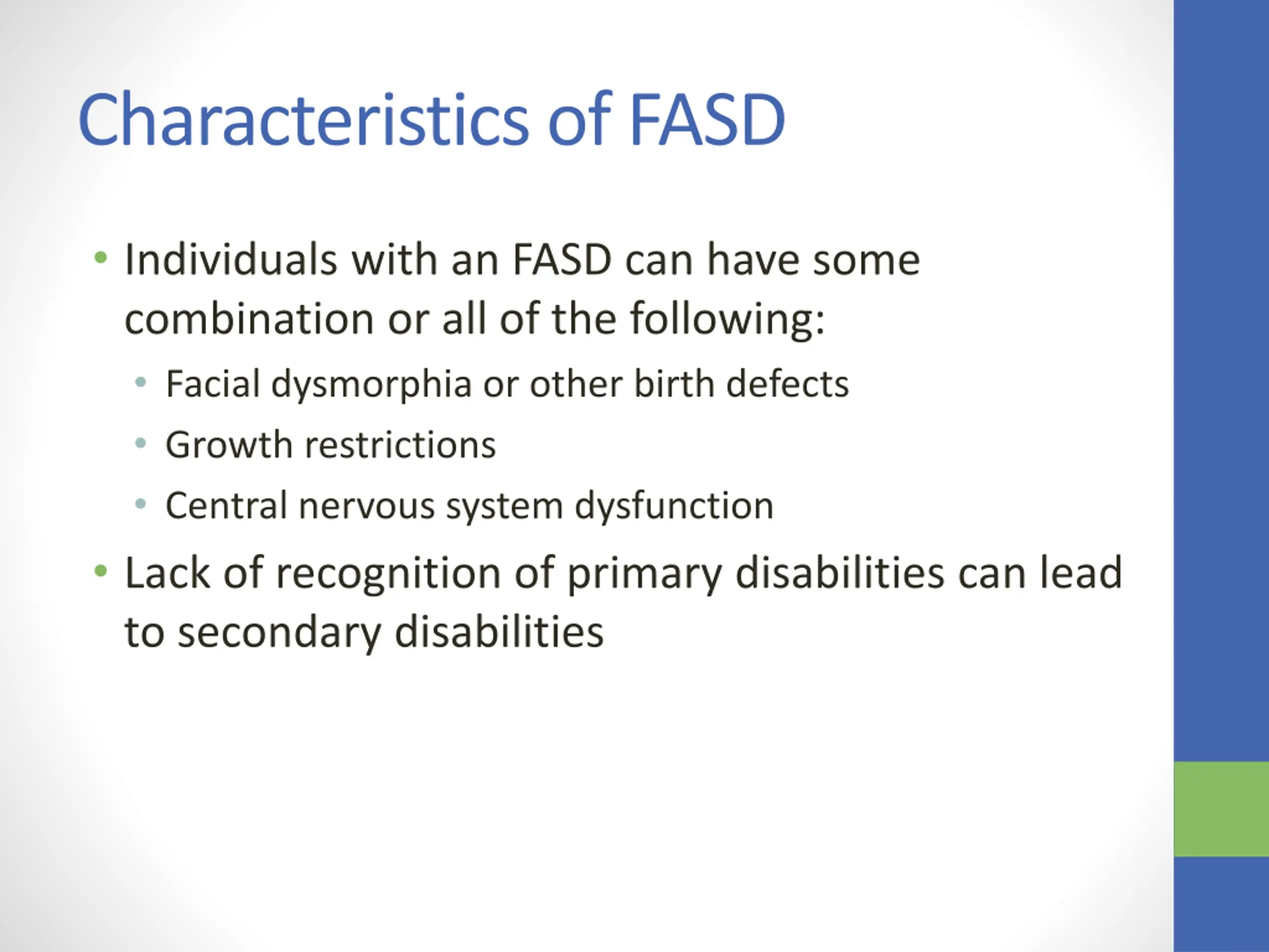 Characteristics of FASD Individuals with an FASD can have some combination or all of the following: Facial dysmorphia or other birth defects Growth restrictions Central nervous system dysfunction Lack of recognition of primary disabilities can lead to secondary disabilities