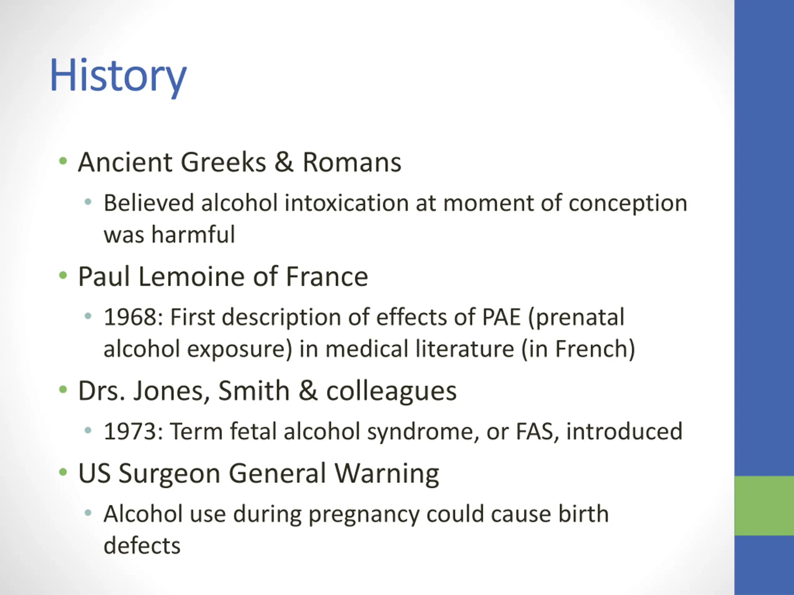 History Ancient Greeks & Romans Believed alcohol intoxication at moment of conception was harmful Paul Lemoine of France 1968: First description of effects of PAE (prenatal alcohol exposure) in medical literature (in French) Drs. Jones, Smith & colleagues 1973: Term fetal alcohol syndrome, or FAS, introduced US Surgeon General Warning Alcohol use during pregnancy could cause birth defects