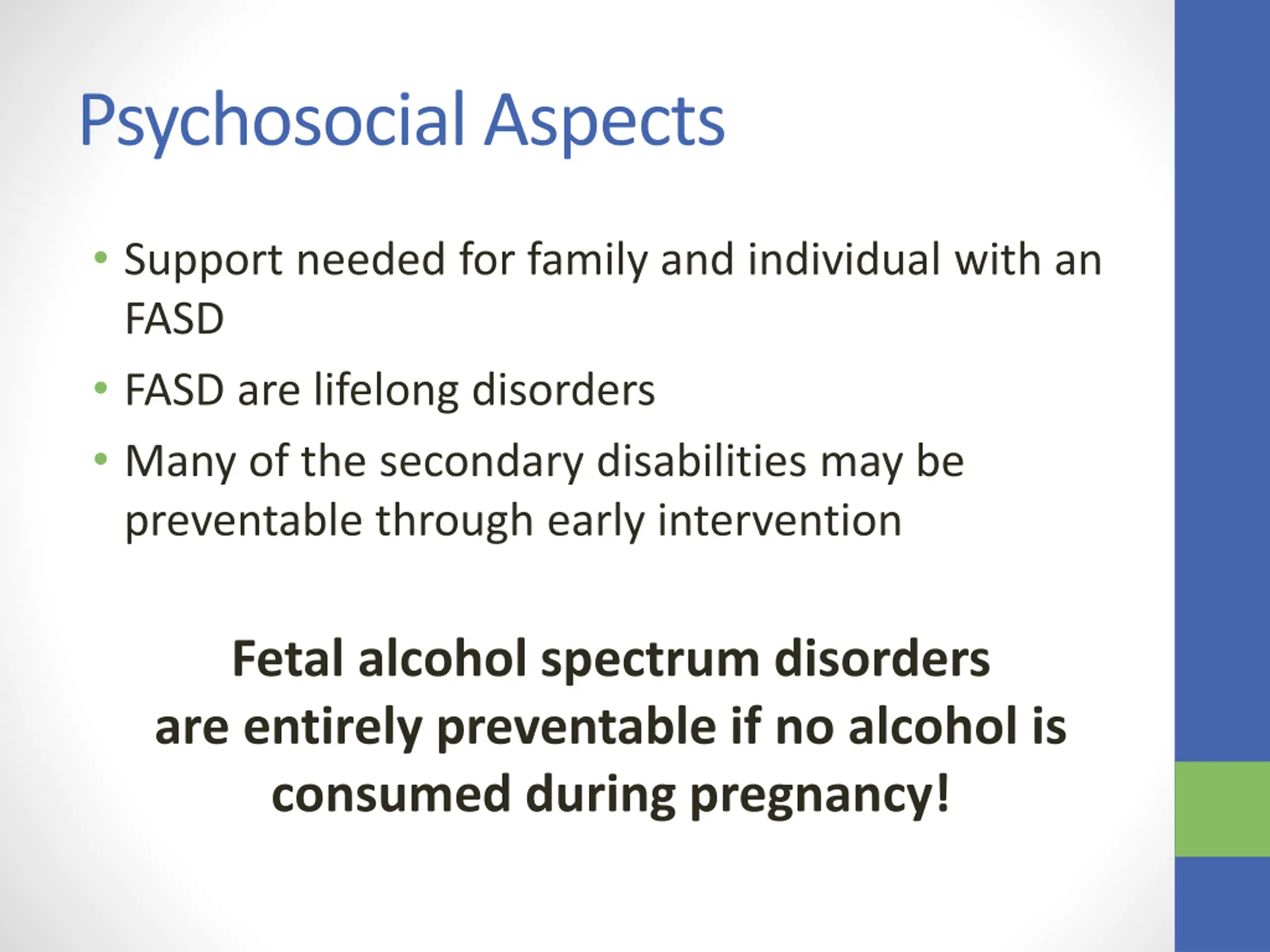 Psychosocial Aspects Support needed for family and individual with an FASD FASD are lifelong disorders Many of the secondary disabilities may be preventable through early intervention Fetal alcohol spectrum disorders are entirely preventable if no alcohol is consumed during pregnancy!