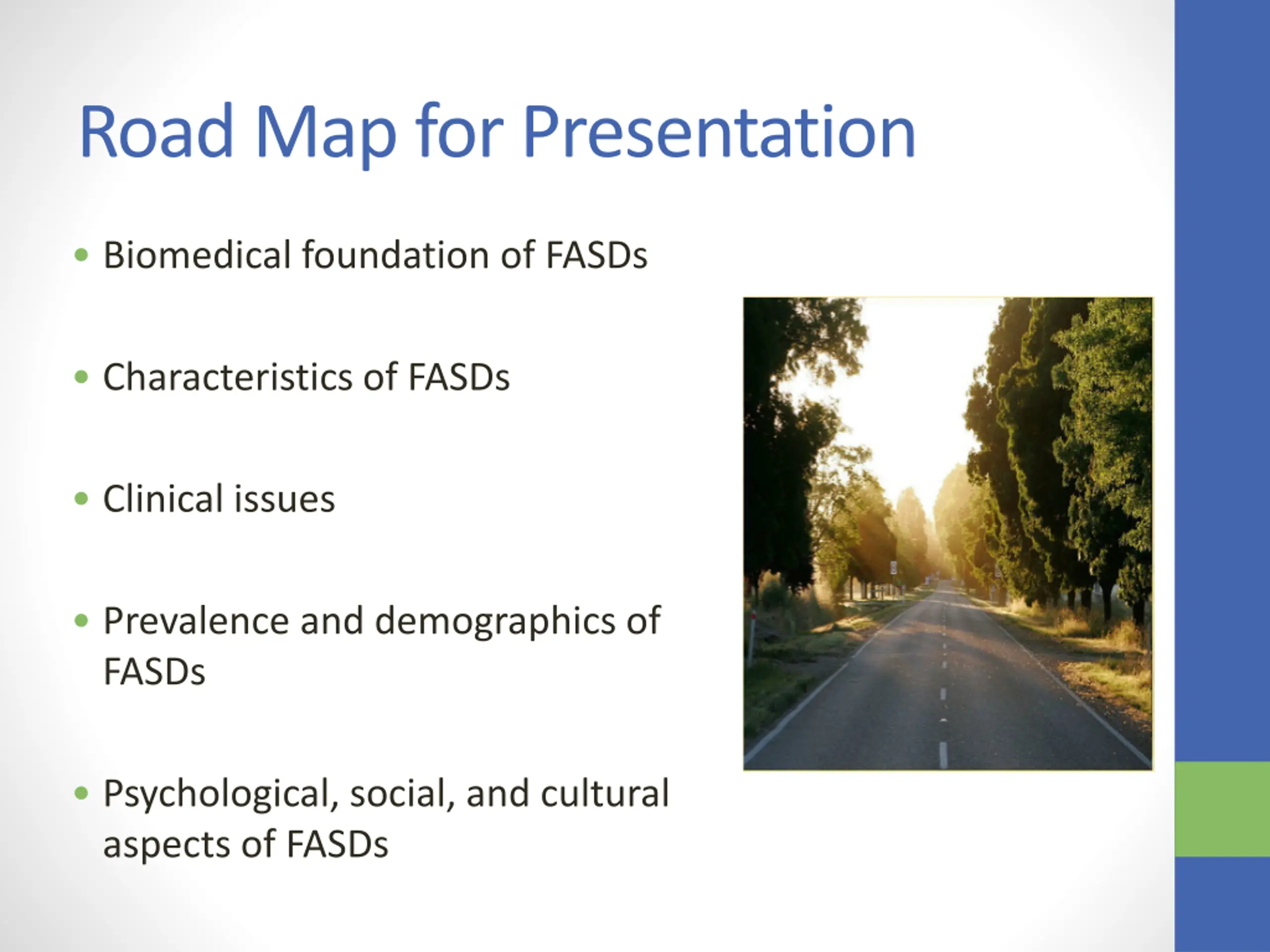 Road Map for Presentation Biomedical foundation of FASDs Characteristics of FASDs Clinical issues Prevalence and demographics of FASDs Psychological, social, and cultural aspects of FASDs