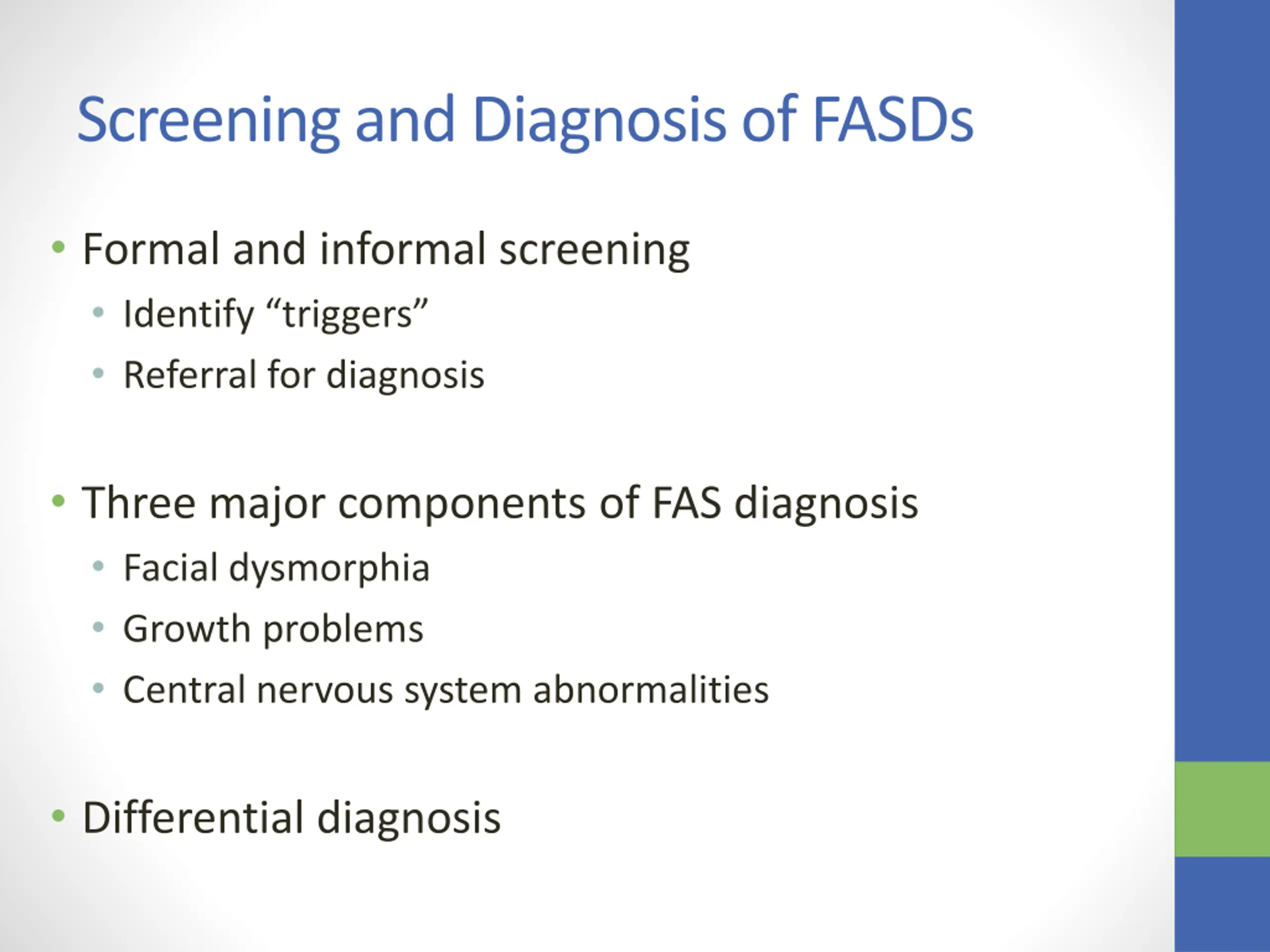 Screening and Diagnosis of FASDs Formal and informal screening Identify triggers Referral for diagnosis Three major components of FAS diagnosis Facial dysmorphia Growth problems Central nervous system abnormalities Differential diagnosis