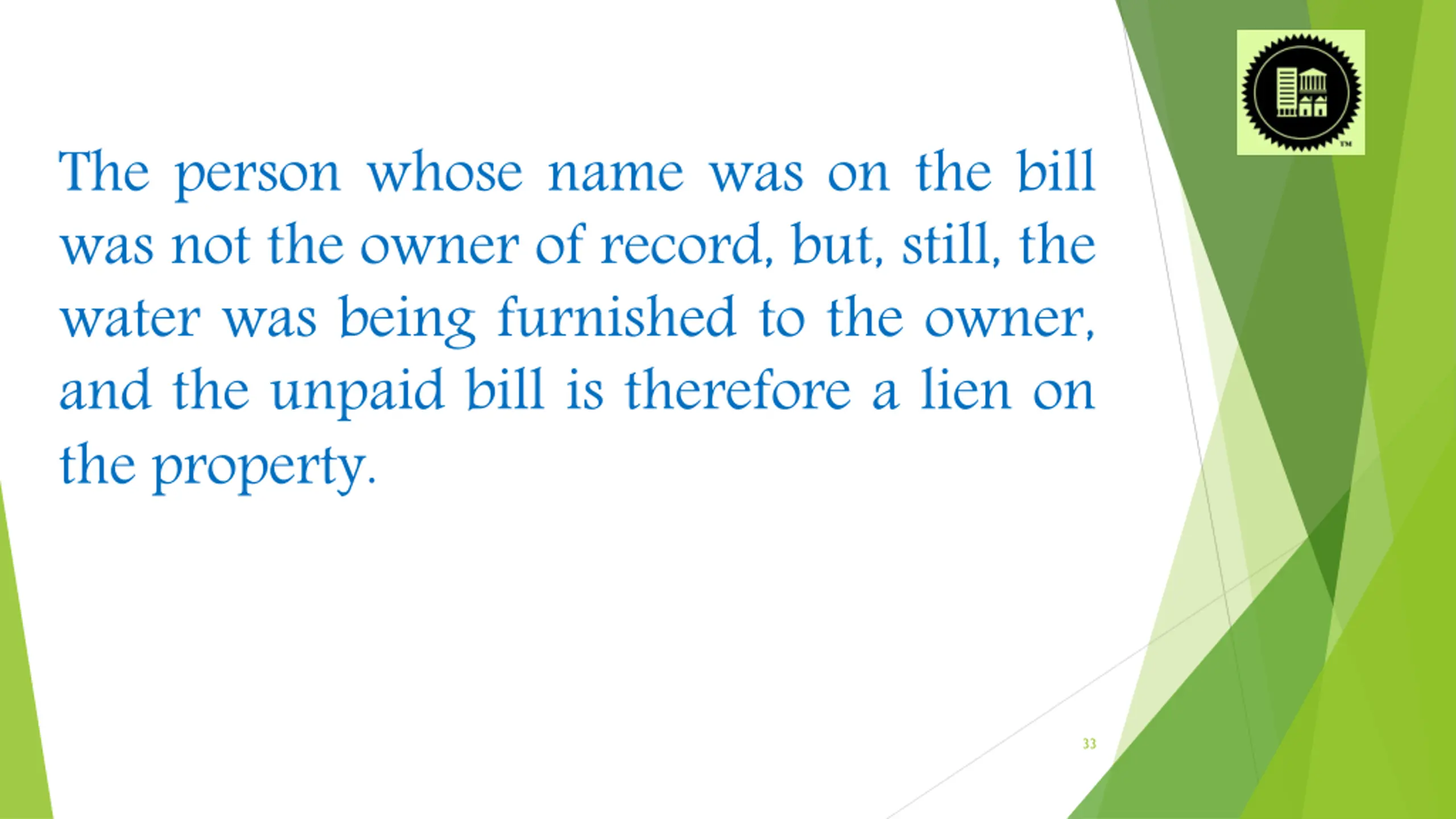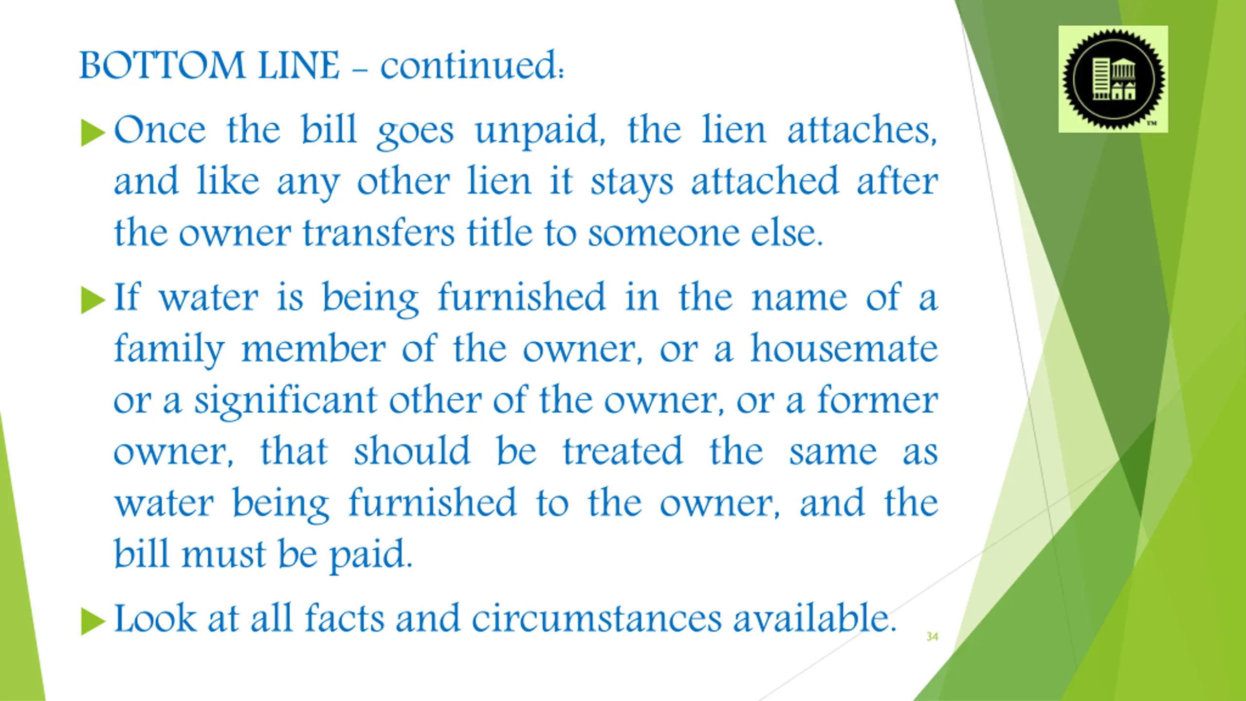 BOTTOM LINE - continued: Once the bill goes unpaid, the lien attaches, and like any other lien it stays attached after the owner transfers title to someone else. If water is being furnished in the name of a family member of the owner, or a housemate or a significant other of the owner, or a former owner, that should be treated the same as water being furnished to the owner, and the bill must be paid. Look at all facts and circumstances available. 34