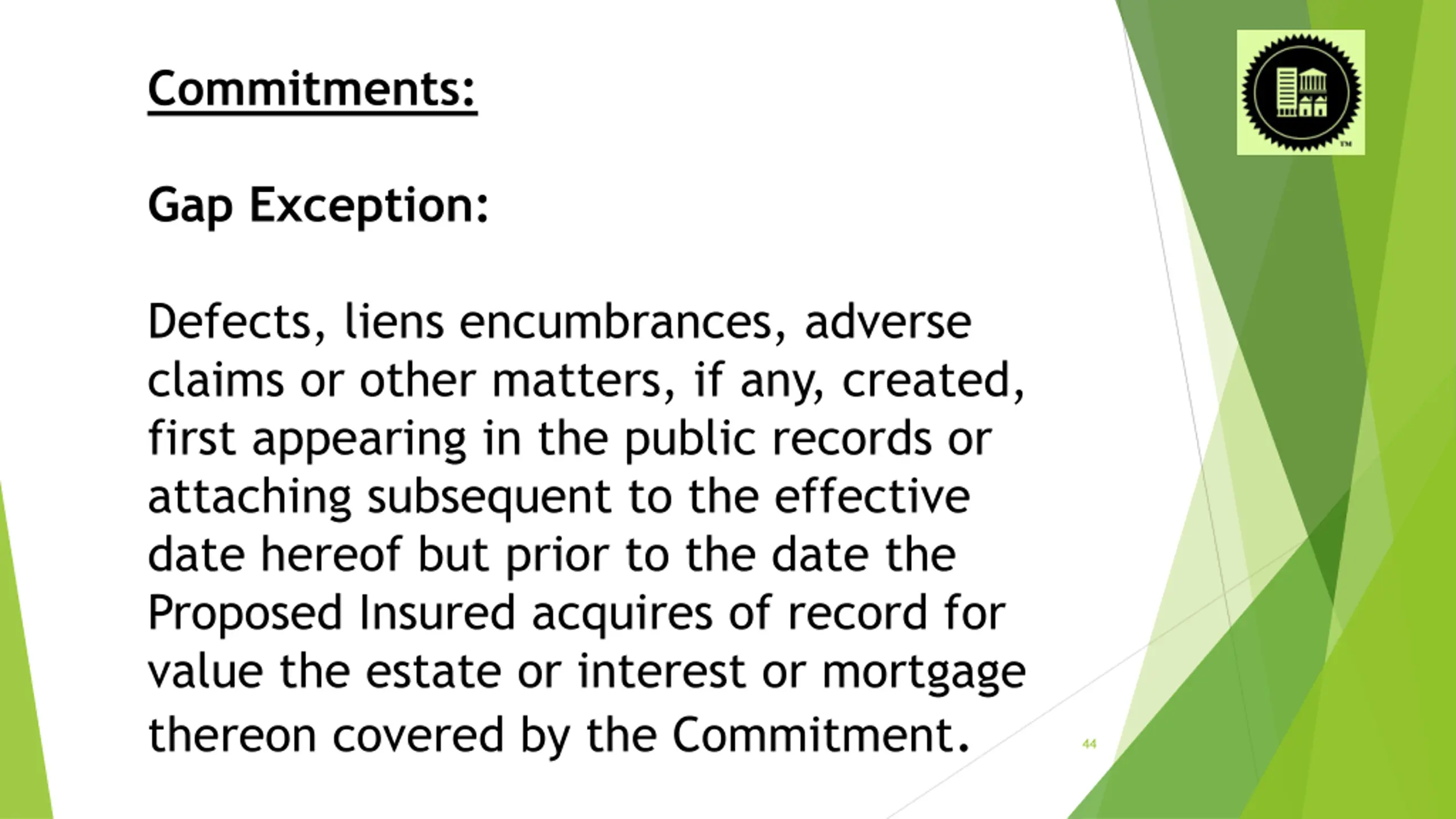 Commitments: Gap Exception: Defects, liens encumbrances, adverse claims or other matters, if any, created, first appearing in the public records or attaching subsequent to the effective date hereof but prior to the date the Proposed Insured acquires of record for value the estate or interest or mortgage thereon covered by the Commitment. 44