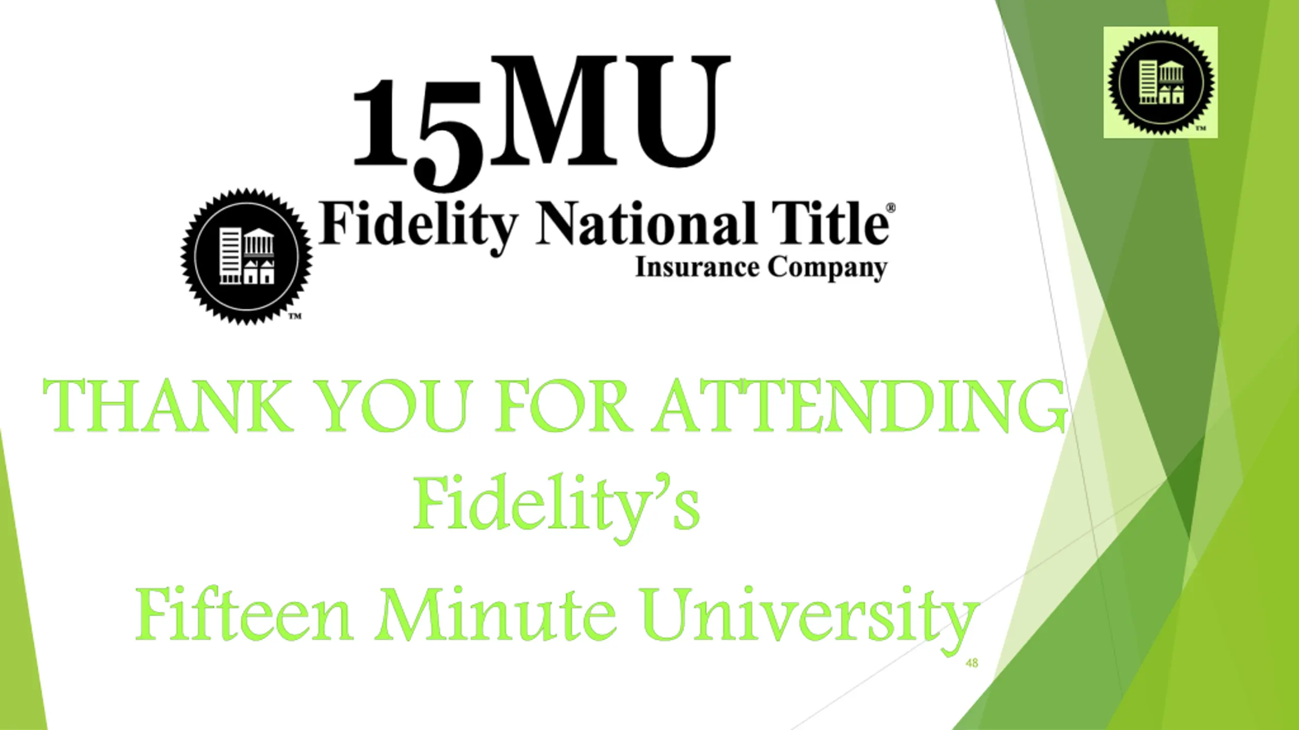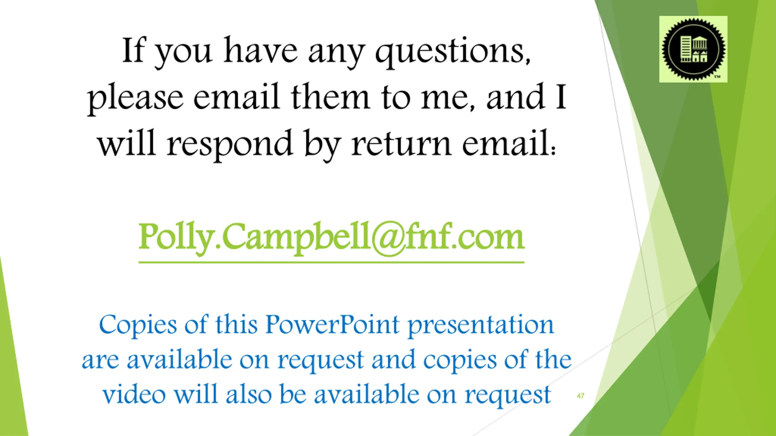If you have any questions, please email them to me, and I will respond by return email: Polly.Campbell@fnf.com Polly.Campbell@fnf.com Copies of this PowerPoint presentation are available on request and copies of the video will also be available on request 47