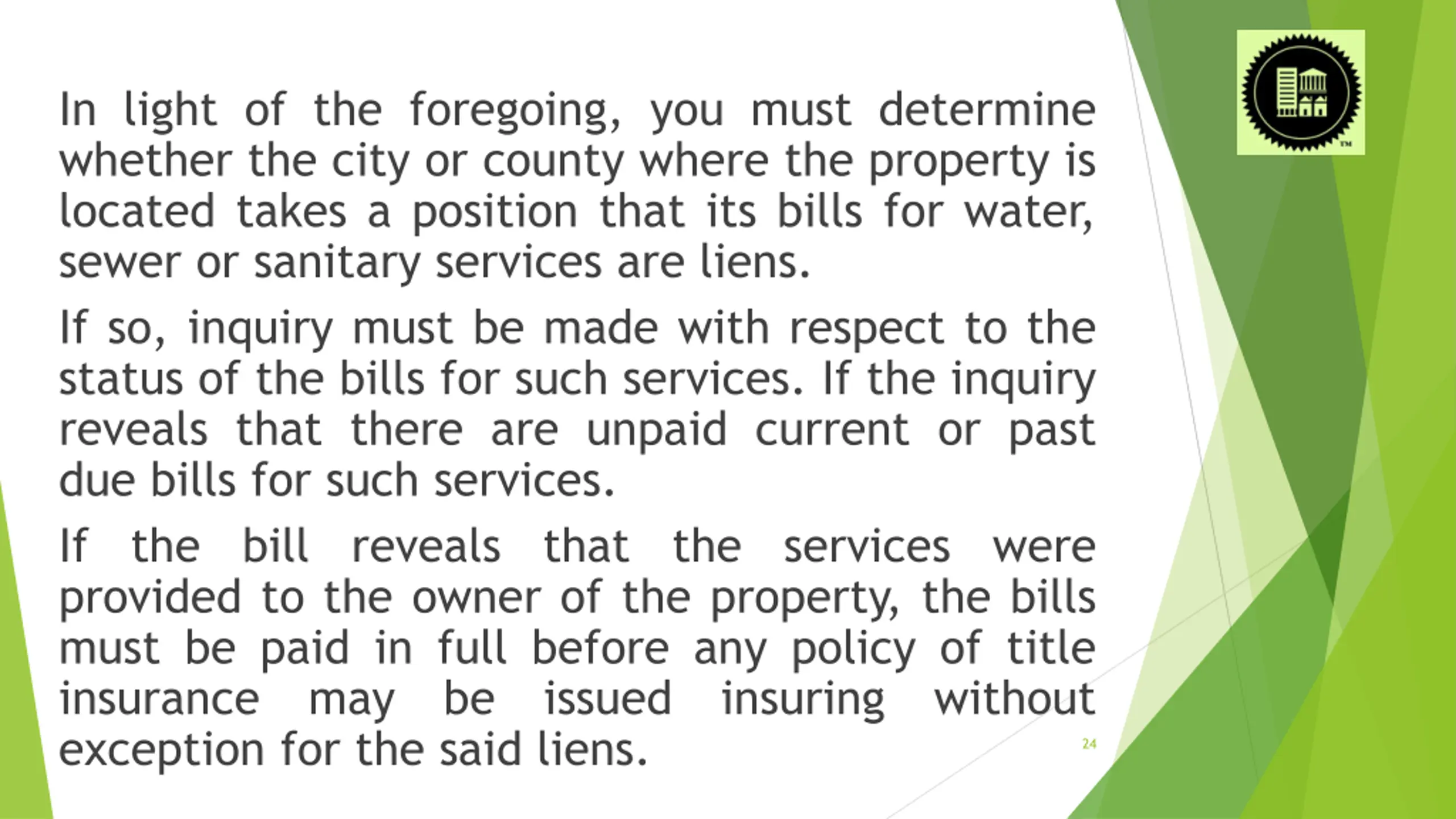 In light of the foregoing, you must determine whether the city or county where the property is located takes a position that its bills for water, sewer or sanitary services are liens. If so, inquiry must be made with respect to the status of the bills for such services. If the inquiry reveals that there are unpaid current or past due bills for such services. If the bill reveals that the services were provided to the owner of the property, the bills must be paid in full before any policy of title insurance may be issued insuring without exception for the said liens. 24