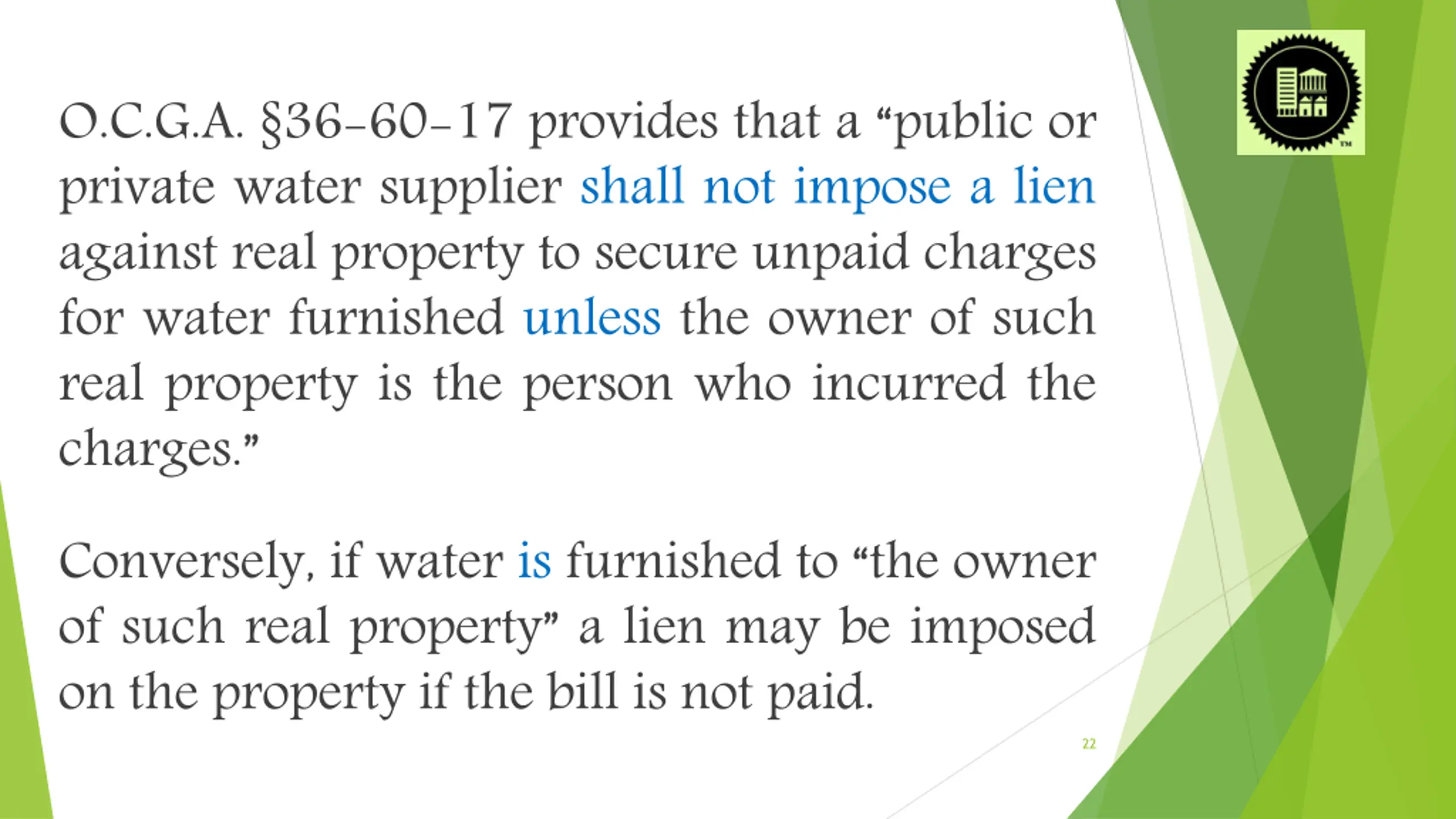 O.C.G.A. 36-60-17 provides that a public or private water supplier shall not impose a lien against real property to secure unpaid charges for water furnished unless the owner of such real property is the person who incurred the charges. Conversely, if water is furnished to the owner of such real property a lien may be imposed on the property if the bill is not paid. 22