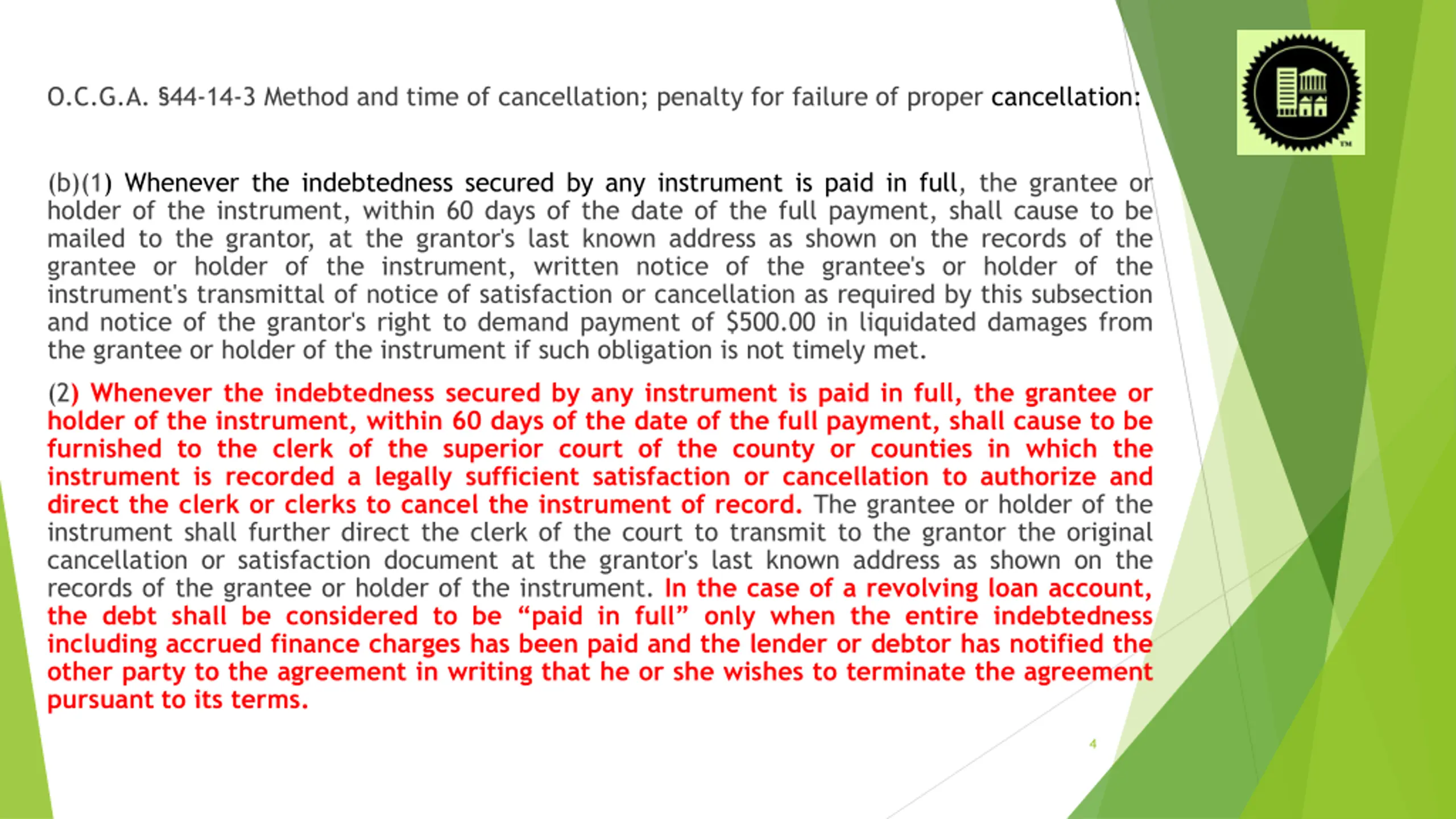 O.C.G.A. 44-14-3 Method and time of cancellation; penalty for failure of proper cancellation: (b)(1) Whenever the indebtedness secured by any instrument is paid in full, the grantee or holder of the instrument, within 60 days of the date of the full payment, shall cause to be mailed to the grantor, at the grantor's last known address as shown on the records of the grantee or holder of the instrument, written notice of the grantee's or holder of the instrument's transmittal of notice of satisfaction or cancellation as required by this subsection and notice of the grantor's right to demand payment of $500.00 in liquidated damages from the grantee or holder of the instrument if such obligation is not timely met. (2) Whenever the indebtedness secured by any instrument is paid in full, the grantee or holder of the instrument, within 60 days of the date of the full payment, shall cause to be furnished to the clerk of the superior court of the county or counties in which the instrument is recorded a legally sufficient satisfaction or cancellation to authorize and direct the clerk or clerks to cancel the instrument of record. The grantee or holder of the instrument shall further direct the clerk of the court to transmit to the grantor the original cancellation or satisfaction document at the grantor's last known address as shown on the records of the grantee or holder of the instrument. In the case of a revolving loan account, the debt shall be considered to be paid in full only when the entire indebtedness including accrued finance charges has been paid and the lender or debtor has notified the other party to the agreement in writing that he or she wishes to terminate the agreement pursuant to its terms. 4