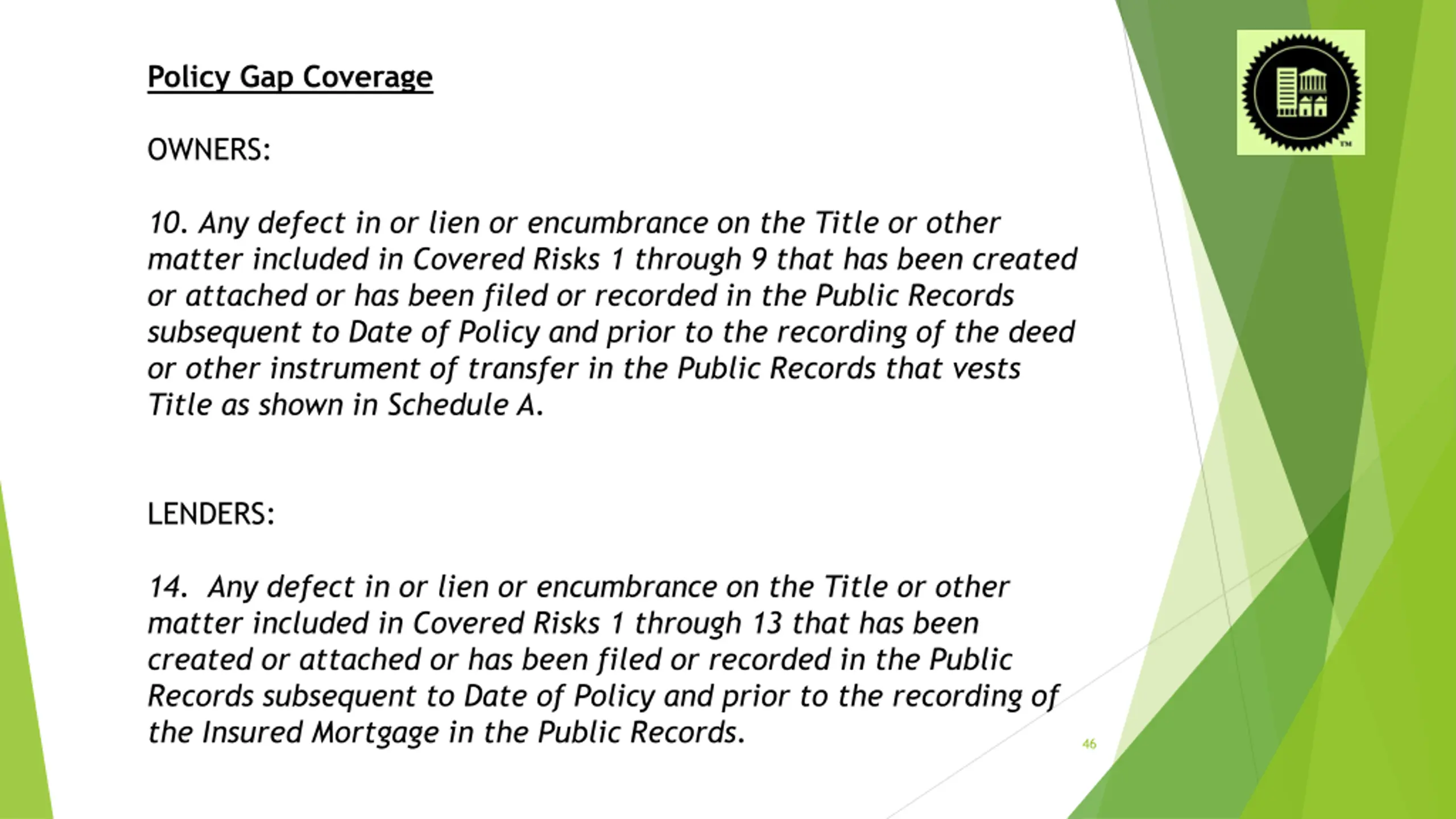 Policy Gap Coverage OWNERS: 10. Any defect in or lien or encumbrance on the Title or other matter included in Covered Risks 1 through 9 that has been created or attached or has been filed or recorded in the Public Records subsequent to Date of Policy and prior to the recording of the deed or other instrument of transfer in the Public Records that vests Title as shown in Schedule A. LENDERS: 14. Any defect in or lien or encumbrance on the Title or other matter included in Covered Risks 1 through 13 that has been created or attached or has been filed or recorded in the Public Records subsequent to Date of Policy and prior to the recording of the Insured Mortgage in the Public Records. 46