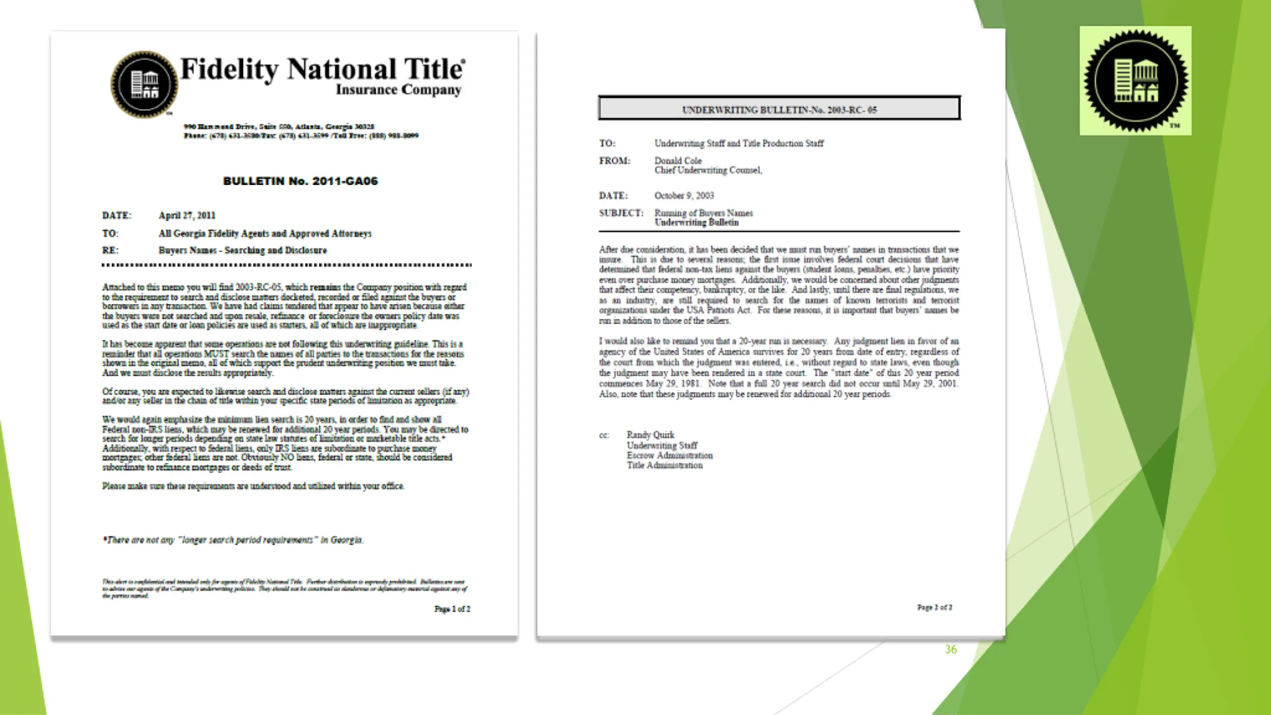 The 2003 bulletin from our Chief Underwriting Counsel said: After due consideration, it has been decided that we must run buyers names in transactions that we insure. This is due to: 1.Federal court decisions that have determined that federal non-tax liens against the buyers (student loans, penalties, etc.) have priority even over purchase money mortgages. 2.Additionally, we would be concerned about other judgments that affect their competency, bankruptcy, or the like. 37