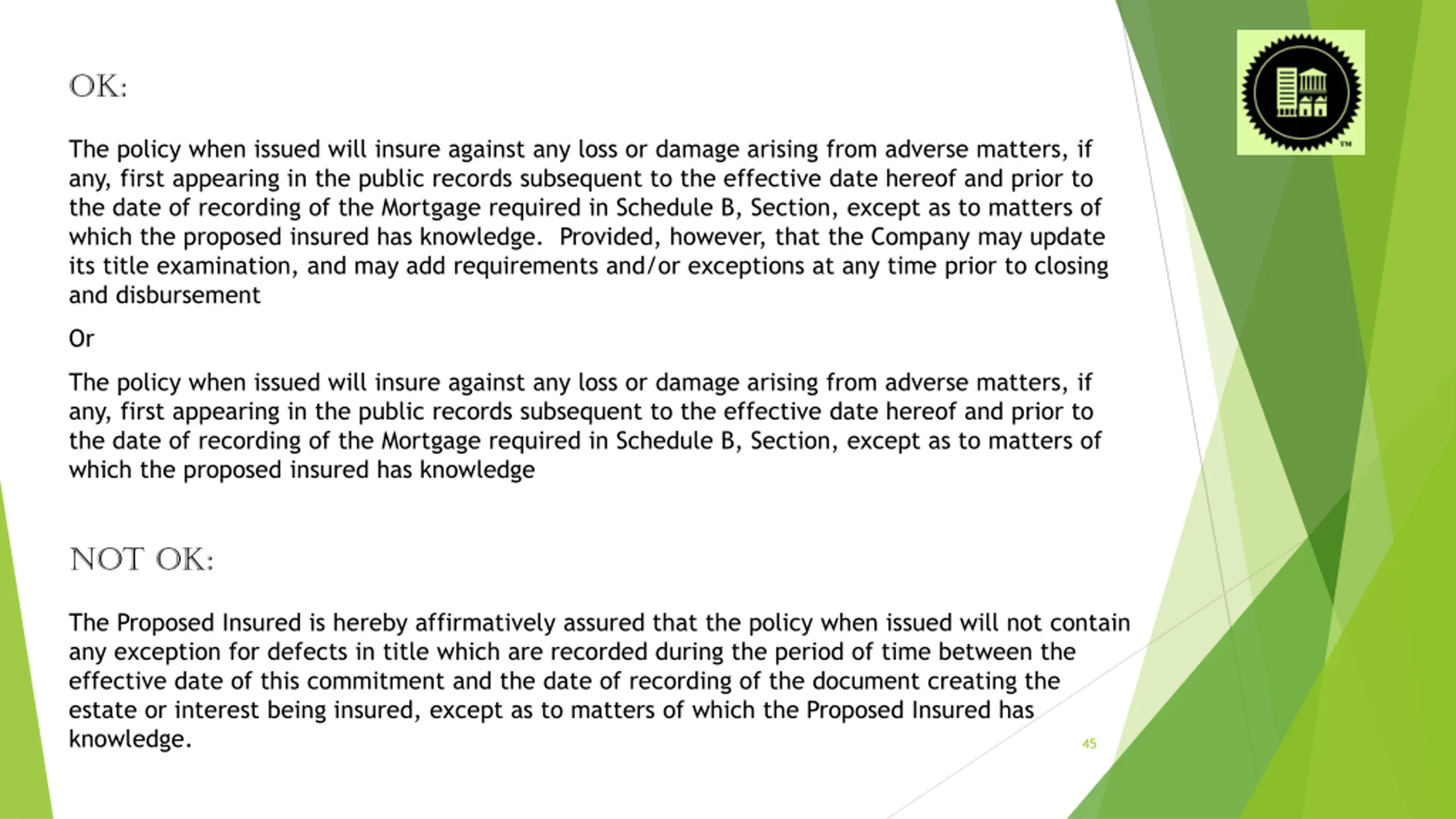 OK: The policy when issued will insure against any loss or damage arising from adverse matters, if any, first appearing in the public records subsequent to the effective date hereof and prior to the date of recording of the Mortgage required in Schedule B, Section, except as to matters of which the proposed insured has knowledge. Provided, however, that the Company may update its title examination, and may add requirements and/or exceptions at any time prior to closing and disbursement Or The policy when issued will insure against any loss or damage arising from adverse matters, if any, first appearing in the public records subsequent to the effective date hereof and prior to the date of recording of the Mortgage required in Schedule B, Section, except as to matters of which the proposed insured has knowledge NOT OK: The Proposed Insured is hereby affirmatively assured that the policy when issued will not contain any exception for defects in title which are recorded during the period of time between the effective date of this commitment and the date of recording of the document creating the estate or interest being insured, except as to matters of which the Proposed Insured has knowledge. 45
