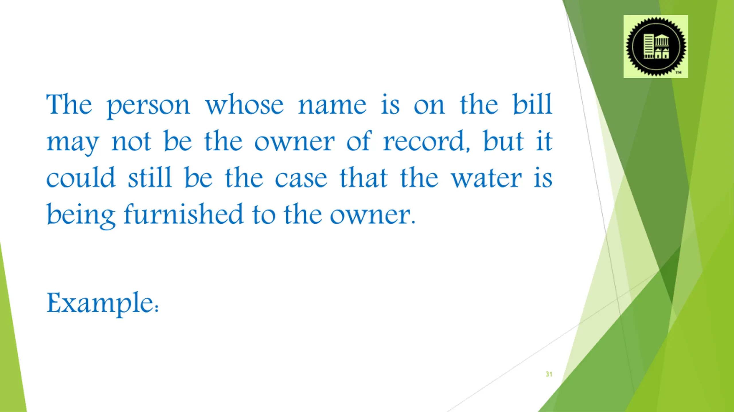 The person whose name is on the bill may not be the owner of record, but it could still be the case that the water is being furnished to the owner. Example: 31