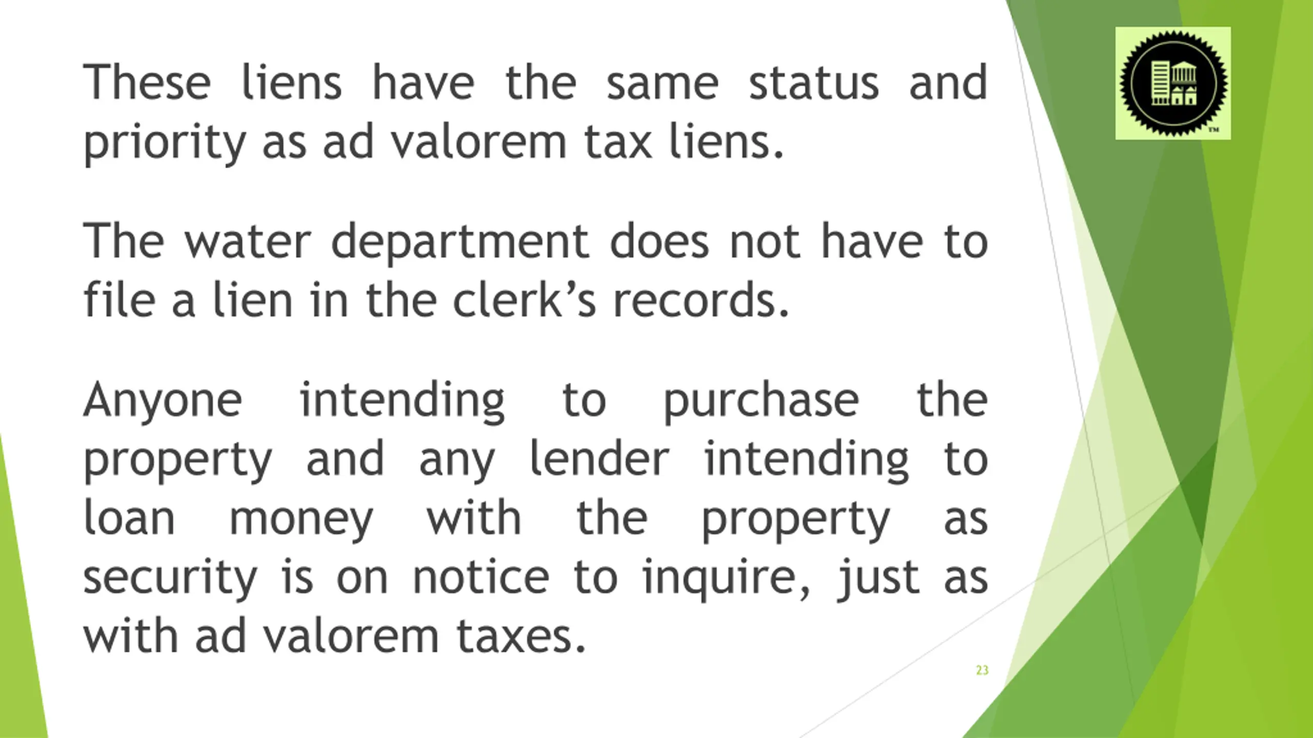 These liens have the same status and priority as ad valorem tax liens. The water department does not have to file a lien in the clerk s records. Anyone intending to purchase the property and any lender intending to loan money with the property as security is on notice to inquire, just as with ad valorem taxes. 23
