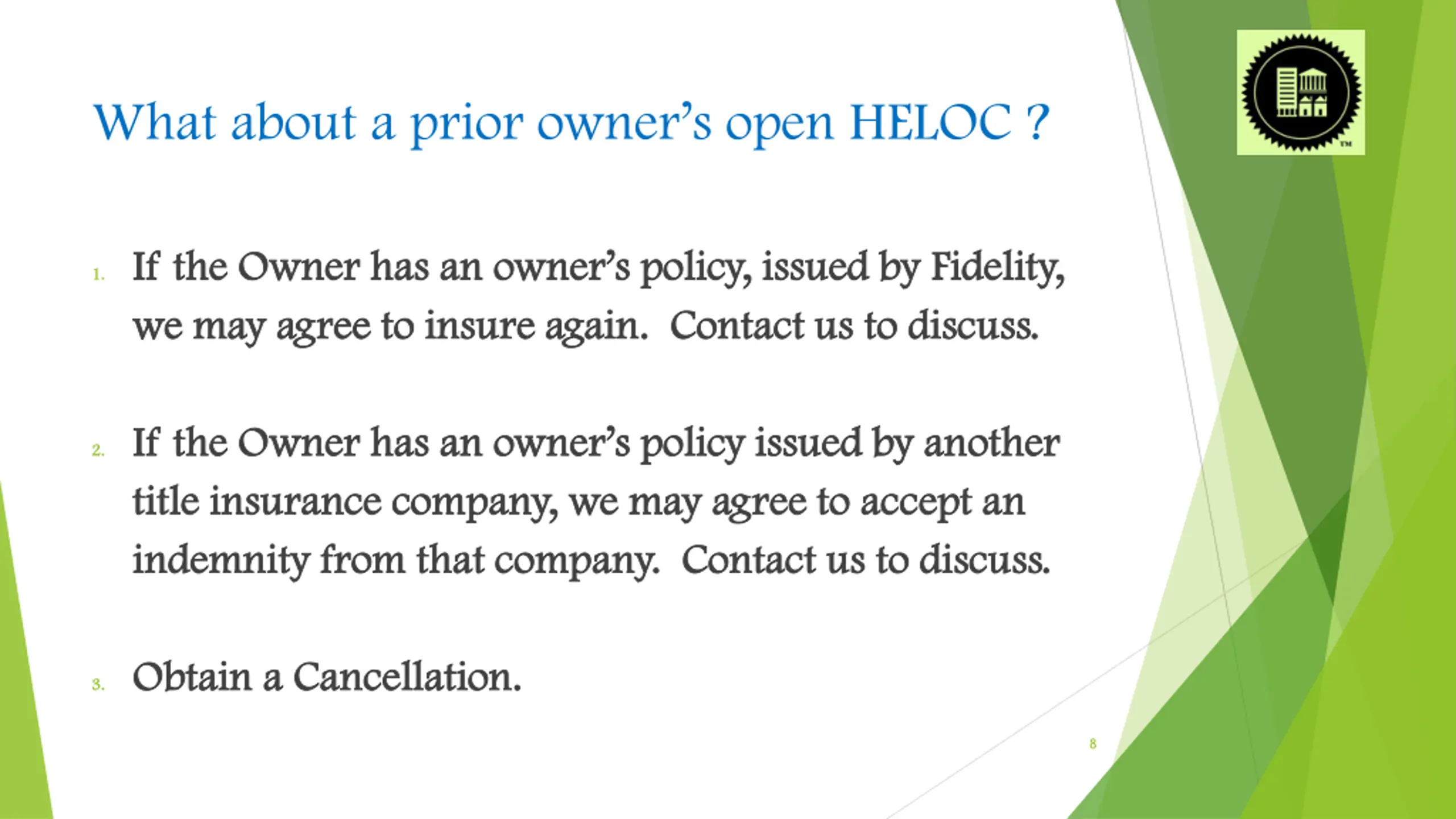 What about a prior owners open HELOC ? 1. 1. If the Owner has an owner s policy, issued by Fidelity, If the Owner has an owner s policy, issued by Fidelity, we may agree to insure again. Contact us to discuss. we may agree to insure again. Contact us to discuss. 2. 2. If the Owner has an owner s policy issued by another If the Owner has an owner s policy issued by another title insurance company, we may agree to accept an title insurance company, we may agree to accept an indemnity from that company. Contact us to discuss. indemnity from that company. Contact us to discuss. 3. 3. Obtain a Cancellation. Obtain a Cancellation. 8