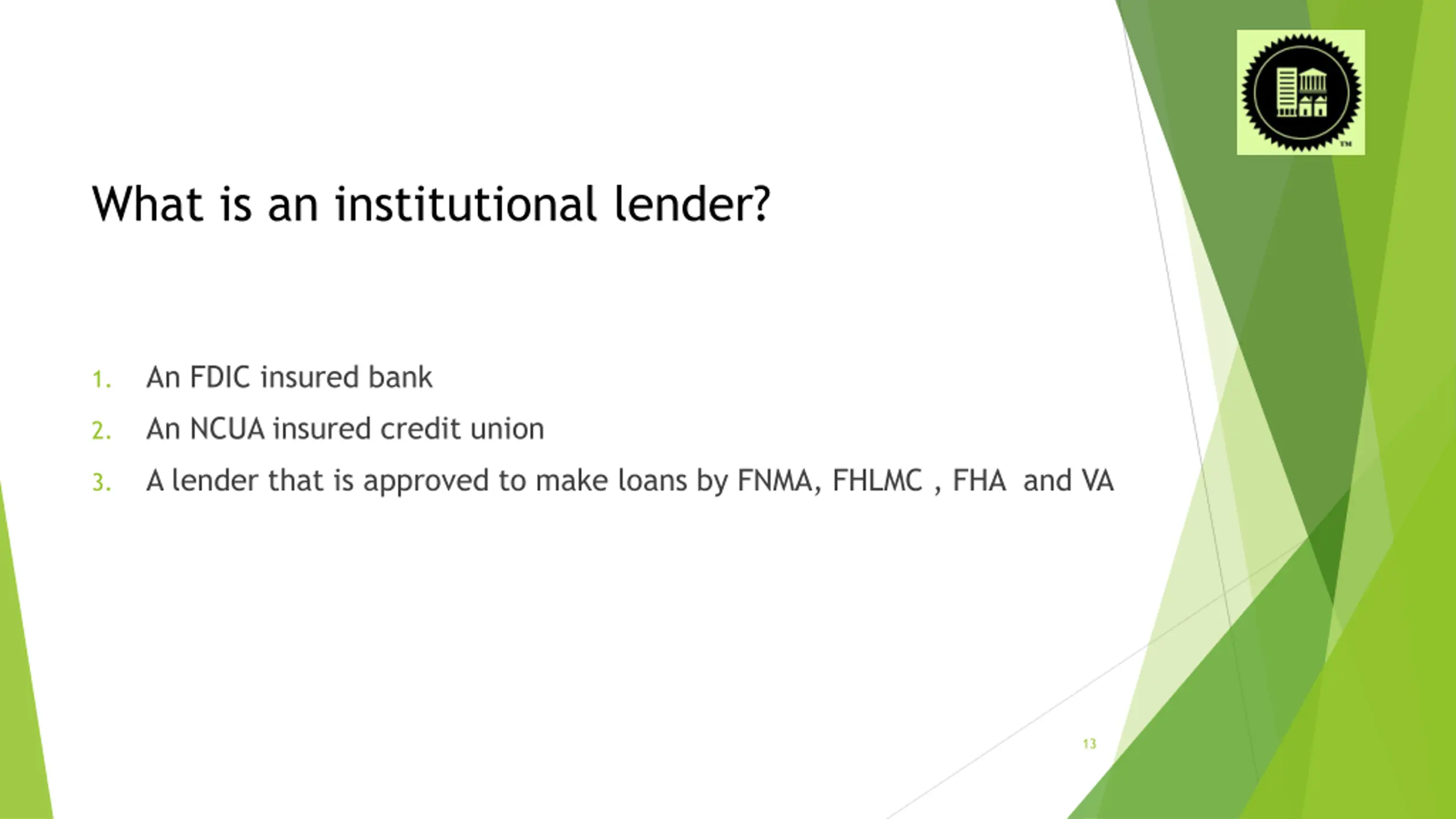What is an institutional lender? An FDIC insured bank 1. An NCUA insured credit union 2. A lender that is approved to make loans by FNMA, FHLMC , FHA and VA 3. 13