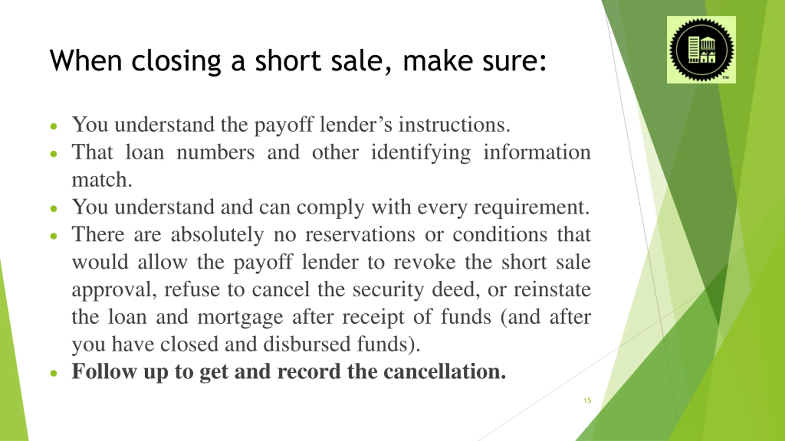 When closing a short sale, make sure: You understand the payoff lender s instructions. That loan numbers and other identifying information match. You understand and can comply with every requirement. There are absolutely no reservations or conditions that would allow the payoff lender to revoke the short sale approval, refuse to cancel the security deed, or reinstate the loan and mortgage after receipt of funds (and after you have closed and disbursed funds). Follow up to get and record the cancellation. 15