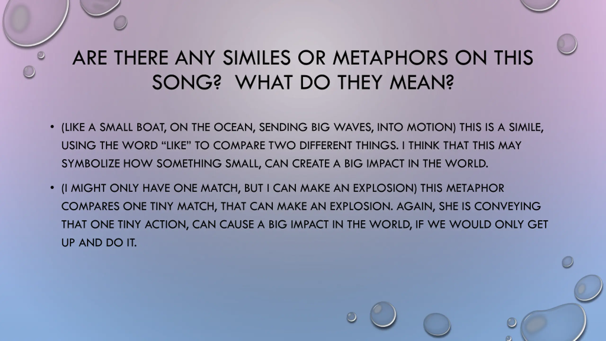 ARE THERE ANY SIMILES OR METAPHORS ON THIS SONG? WHAT DO THEY MEAN? (LIKE A SMALL BOAT, ON THE OCEAN, SENDING BIG WAVES, INTO MOTION) THIS IS A SIMILE, USING THE WORD LIKE TO COMPARE TWO DIFFERENT THINGS. I THINK THAT THIS MAY SYMBOLIZE HOW SOMETHING SMALL, CAN CREATE A BIG IMPACT IN THE WORLD. (I MIGHT ONLY HAVE ONE MATCH, BUT I CAN MAKE AN EXPLOSION) THIS METAPHOR COMPARES ONE TINY MATCH, THAT CAN MAKE AN EXPLOSION. AGAIN, SHE IS CONVEYING THAT ONE TINY ACTION, CAN CAUSE A BIG IMPACT IN THE WORLD, IF WE WOULD ONLY GET UP AND DO IT.