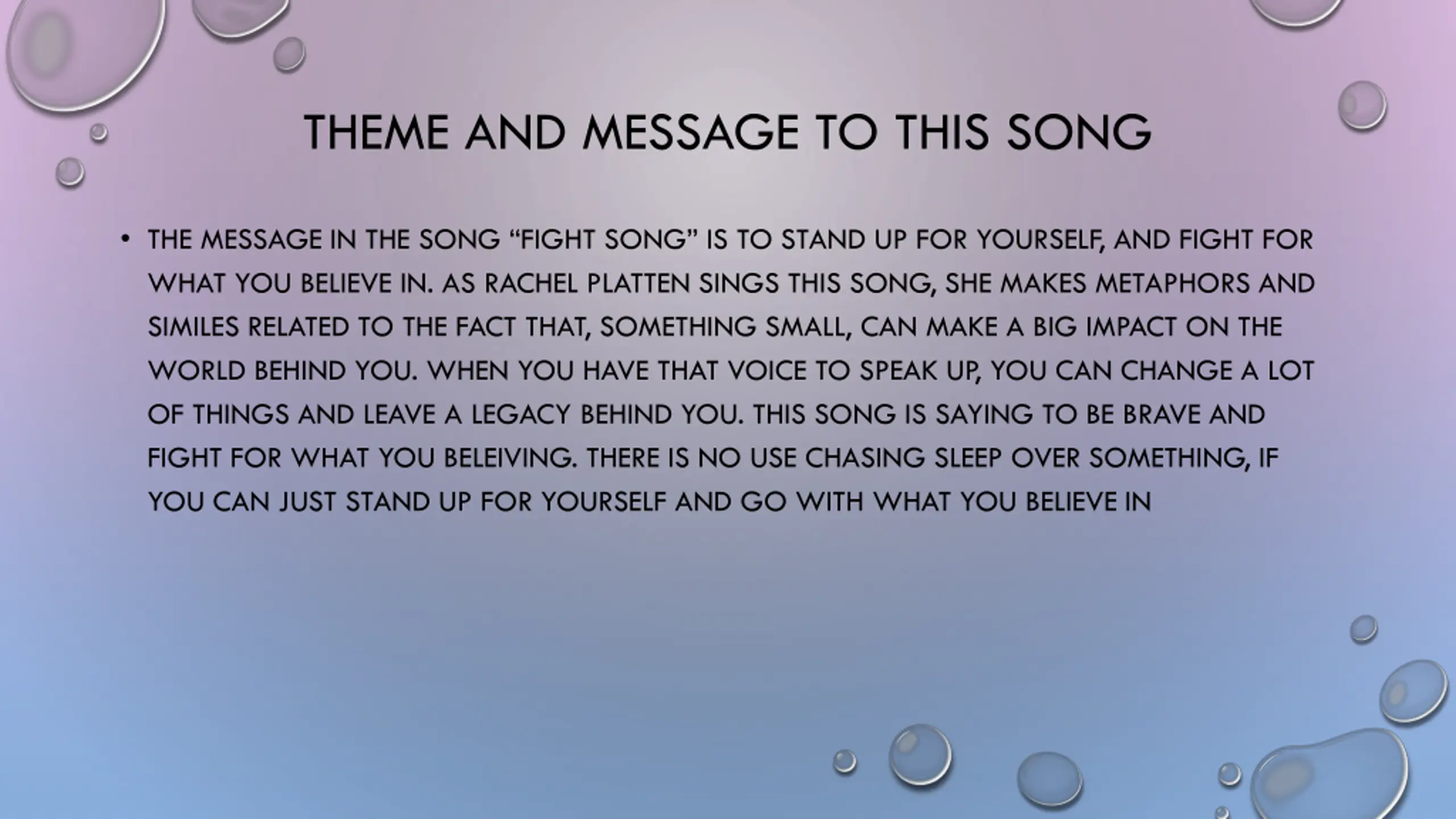 THEME AND MESSAGE TO THIS SONG THE MESSAGE IN THE SONG FIGHT SONG IS TO STAND UP FOR YOURSELF, AND FIGHT FOR WHAT YOU BELIEVE IN. AS RACHEL PLATTEN SINGS THIS SONG, SHE MAKES METAPHORS AND SIMILES RELATED TO THE FACT THAT, SOMETHING SMALL, CAN MAKE A BIG IMPACT ON THE WORLD BEHIND YOU. WHEN YOU HAVE THAT VOICE TO SPEAK UP, YOU CAN CHANGE A LOT OF THINGS AND LEAVE A LEGACY BEHIND YOU. THIS SONG IS SAYING TO BE BRAVE AND FIGHT FOR WHAT YOU BELEIVING. THERE IS NO USE CHASING SLEEP OVER SOMETHING, IF YOU CAN JUST STAND UP FOR YOURSELF AND GO WITH WHAT YOU BELIEVE IN