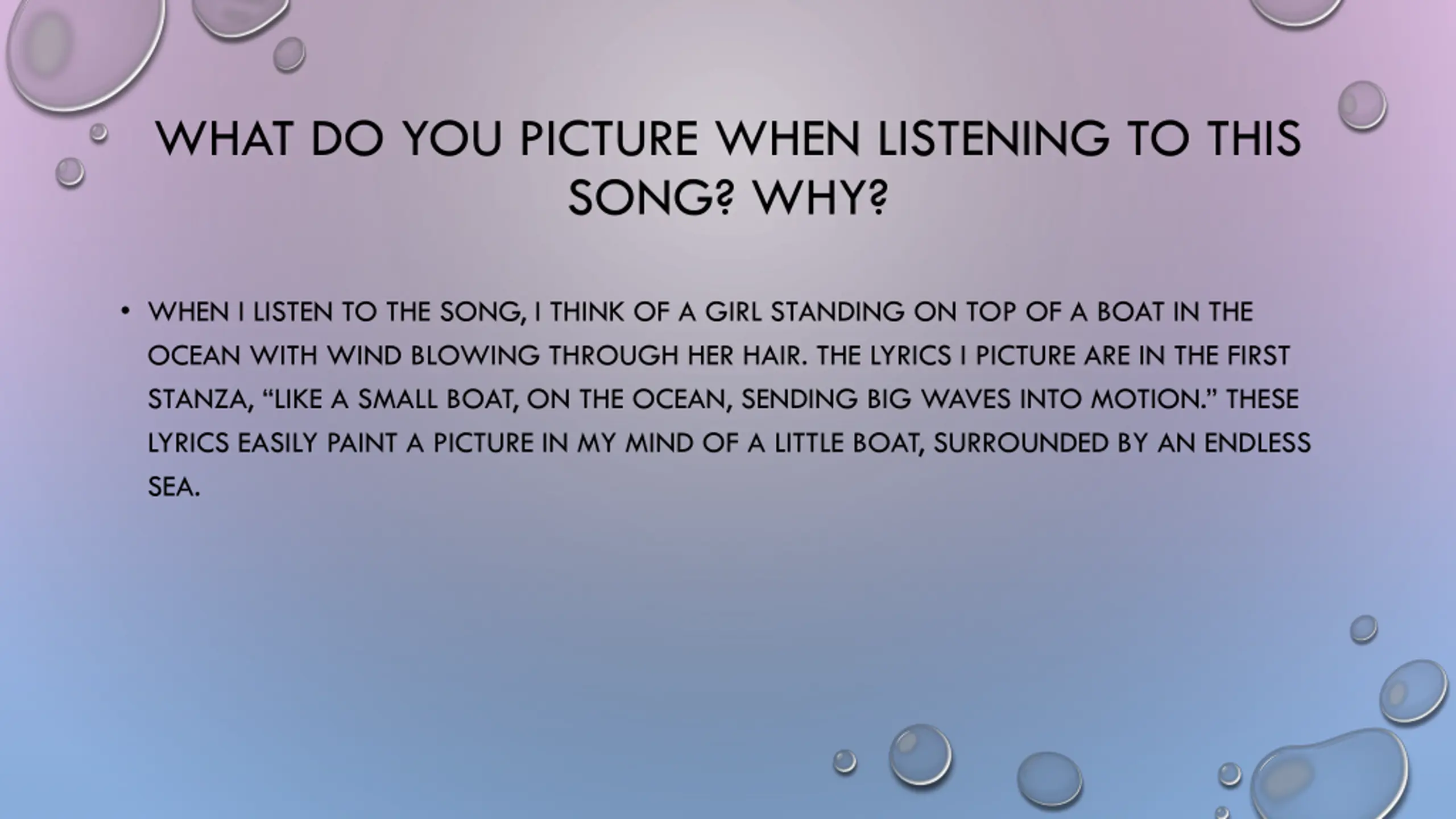 WHAT DO YOU PICTURE WHEN LISTENING TO THIS SONG? WHY? WHEN I LISTEN TO THE SONG, I THINK OF A GIRL STANDING ON TOP OF A BOAT IN THE OCEAN WITH WIND BLOWING THROUGH HER HAIR. THE LYRICS I PICTURE ARE IN THE FIRST STANZA, LIKE A SMALL BOAT, ON THE OCEAN, SENDING BIG WAVES INTO MOTION. THESE LYRICS EASILY PAINT A PICTURE IN MY MIND OF A LITTLE BOAT, SURROUNDED BY AN ENDLESS SEA.