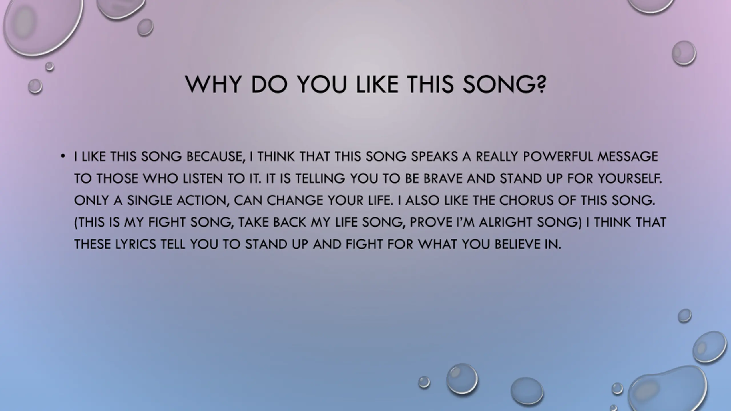 WHY DO YOU LIKE THIS SONG? I LIKE THIS SONG BECAUSE, I THINK THAT THIS SONG SPEAKS A REALLY POWERFUL MESSAGE TO THOSE WHO LISTEN TO IT. IT IS TELLING YOU TO BE BRAVE AND STAND UP FOR YOURSELF. ONLY A SINGLE ACTION, CAN CHANGE YOUR LIFE. I ALSO LIKE THE CHORUS OF THIS SONG. (THIS IS MY FIGHT SONG, TAKE BACK MY LIFE SONG, PROVE I M ALRIGHT SONG) I THINK THAT THESE LYRICS TELL YOU TO STAND UP AND FIGHT FOR WHAT YOU BELIEVE IN.