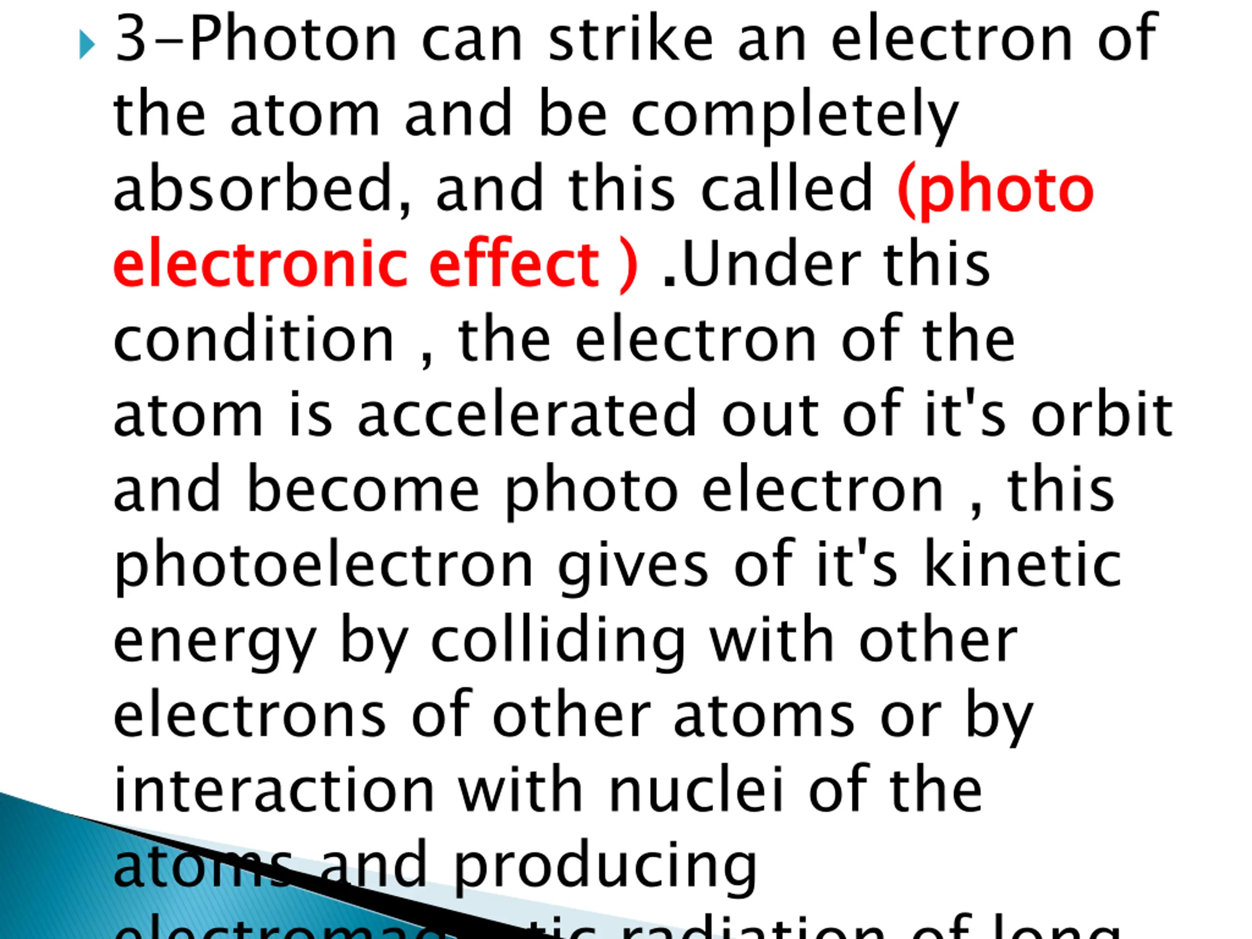 3-Photon can strike an electron of the atom and be completely absorbed, and this called (photo electronic effect ) condition , the electron of the atom is accelerated out of it's orbit and become photo electron , this photoelectron gives of it's kinetic energy by colliding with other electrons of other atoms or by interaction with nuclei of the atoms and producing electromagnetic radiation of long (photo electronic effect ) . .Under this