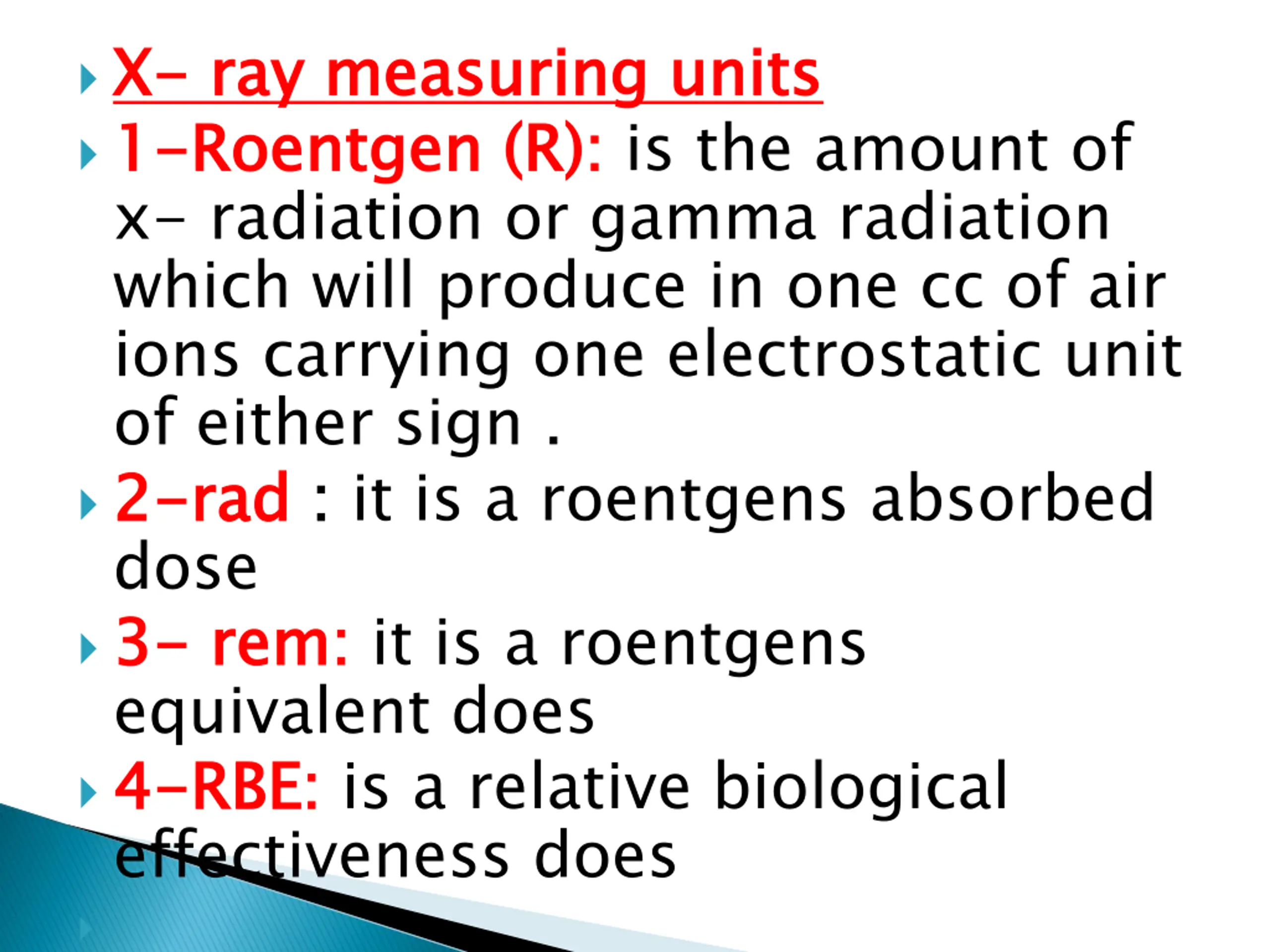 X X- - ray measuring units 1 1- -Roentgen (R): x- radiation or gamma radiation which will produce in one cc of air ions carrying one electrostatic unit of either sign . 2 2- -rad dose 3 3- - rem equivalent does 4 4- -RBE: effectiveness does ray measuring units Roentgen (R): is the amount of rad : : it is a roentgens absorbed rem: : it is a roentgens RBE: is a relative biological