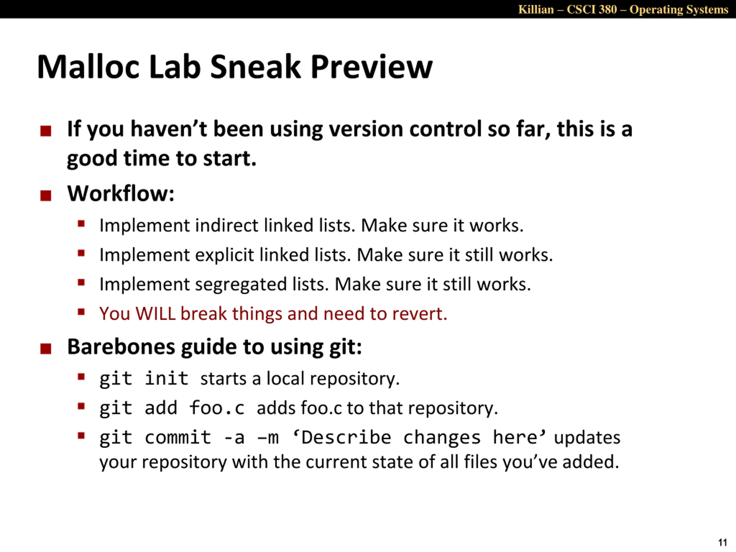Killian CSCI 380 Operating Systems Malloc Lab Sneak Preview If you haven t been using version control so far, this is a good time to start. Workflow: Implement indirect linked lists. Make sure it works. Implement explicit linked lists. Make sure it still works. Implement segregated lists. Make sure it still works. You WILL break things and need to revert. Barebones guide to using git: git init starts a local repository. git add foo.c adds foo.c to that repository. git commit -a m Describe changes here updates your repository with the current state of all files you ve added. 11