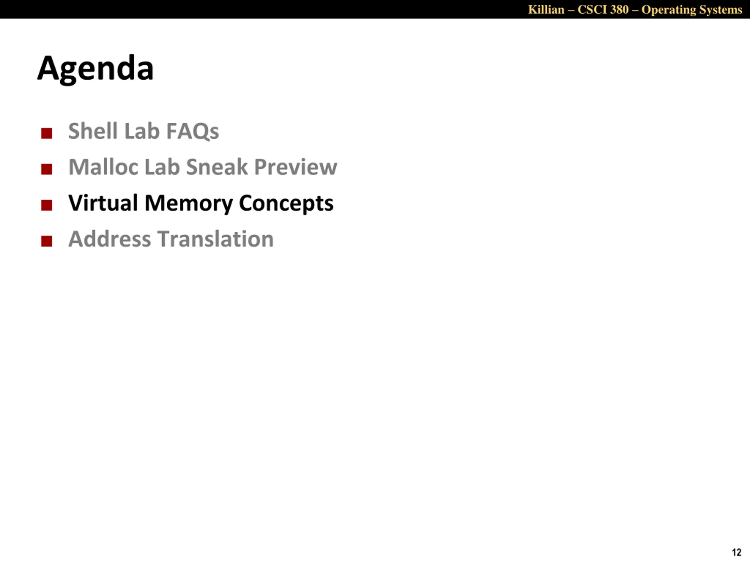 Killian CSCI 380 Operating Systems Agenda Shell Lab FAQs Malloc Lab Sneak Preview Virtual Memory Concepts Address Translation 12