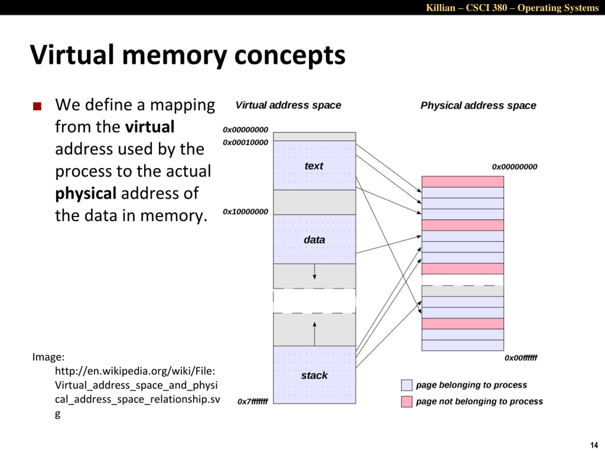 Killian CSCI 380 Operating Systems Virtual memory concepts We define a mapping from the virtual address used by the process to the actual physical address of the data in memory. Image: http://en.wikipedia.org/wiki/File: Virtual_address_space_and_physi cal_address_space_relationship.sv g 14