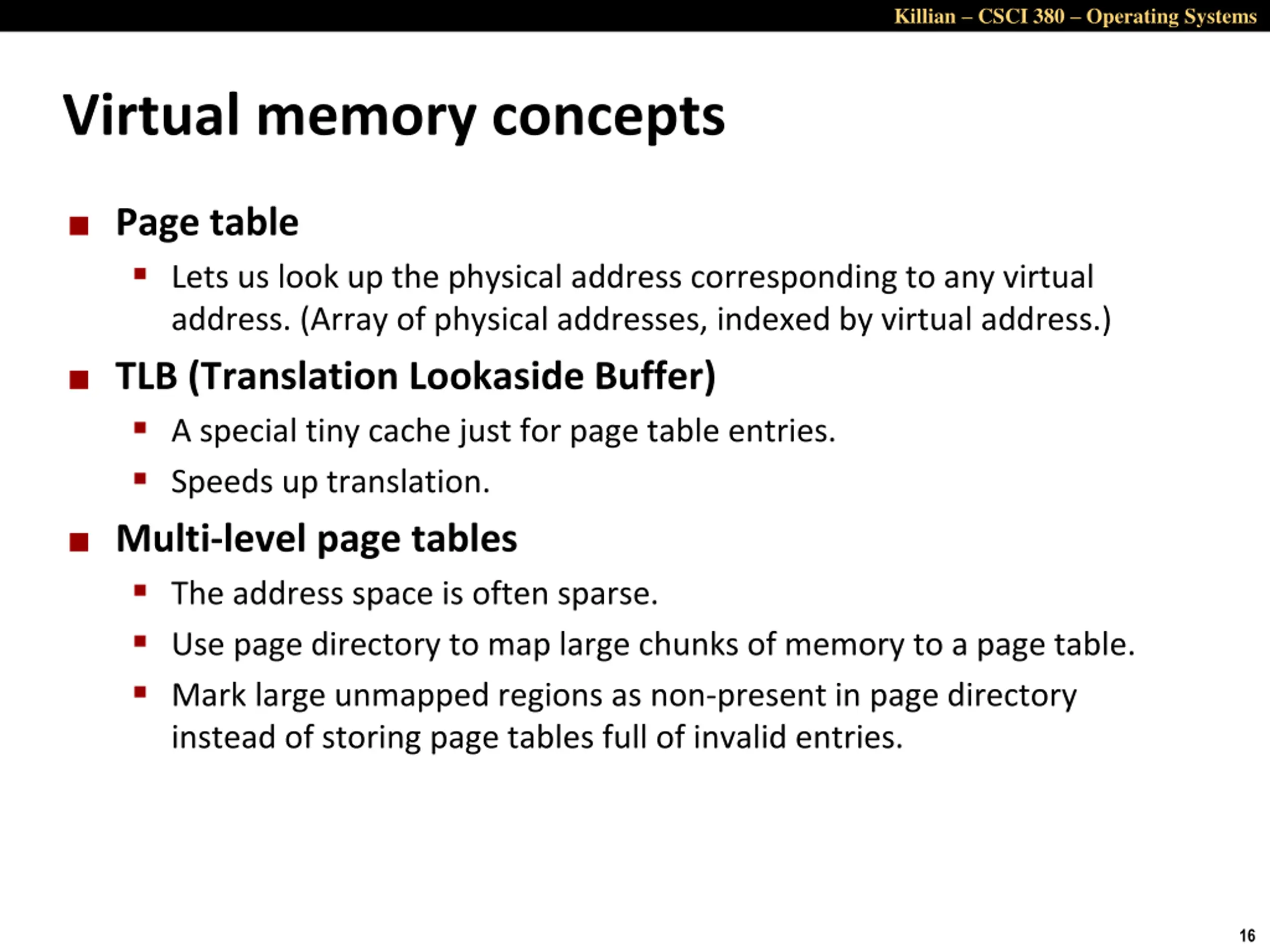 Killian CSCI 380 Operating Systems Virtual memory concepts Page table Lets us look up the physical address corresponding to any virtual address. (Array of physical addresses, indexed by virtual address.) TLB (Translation Lookaside Buffer) A special tiny cache just for page table entries. Speeds up translation. Multi-level page tables The address space is often sparse. Use page directory to map large chunks of memory to a page table. Mark large unmapped regions as non-present in page directory instead of storing page tables full of invalid entries. 16