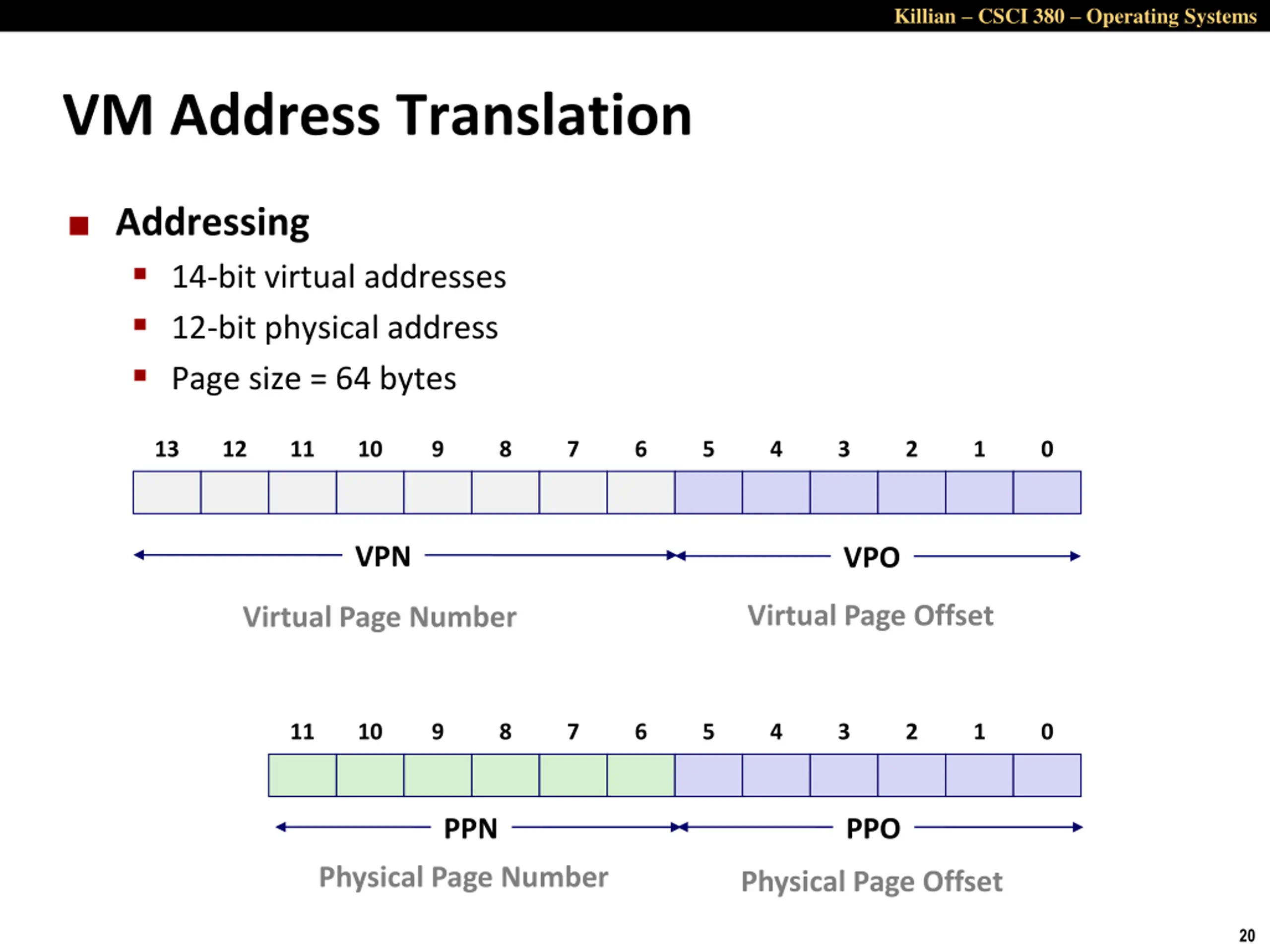 Killian CSCI 380 Operating Systems VM Address Translation Addressing 14-bit virtual addresses 12-bit physical address Page size = 64 bytes 13 12 11 10 9 8 7 6 5 4 3 2 1 0 VPN VPO Virtual Page Offset Virtual Page Number 11 10 9 8 7 6 5 4 3 2 1 0 PPN PPO Physical Page Number Physical Page Offset 20