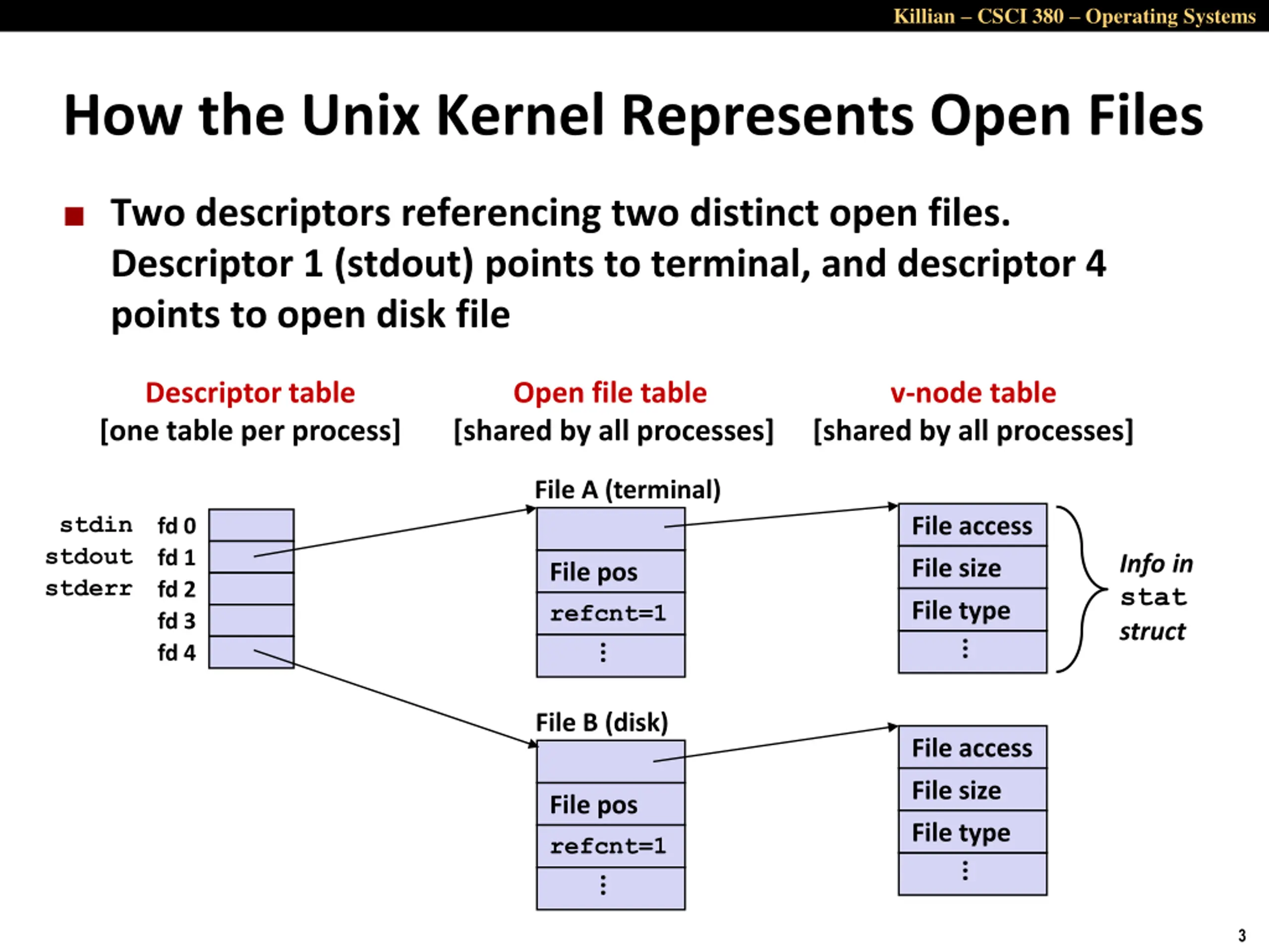 Killian CSCI 380 Operating Systems How the Unix Kernel Represents Open Files Two descriptors referencing two distinct open files. Descriptor 1 (stdout) points to terminal, and descriptor 4 points to open disk file Descriptor table [one table per process] Open file table [shared by all processes] v-node table [shared by all processes] File A (terminal) stdin File access fd 0 fd 1 fd 2 fd 3 fd 4 stdout Info in stat struct File size File pos refcnt=1 ... stderr File type ... File B (disk) File access File size File pos refcnt=1 ... File type ... 3