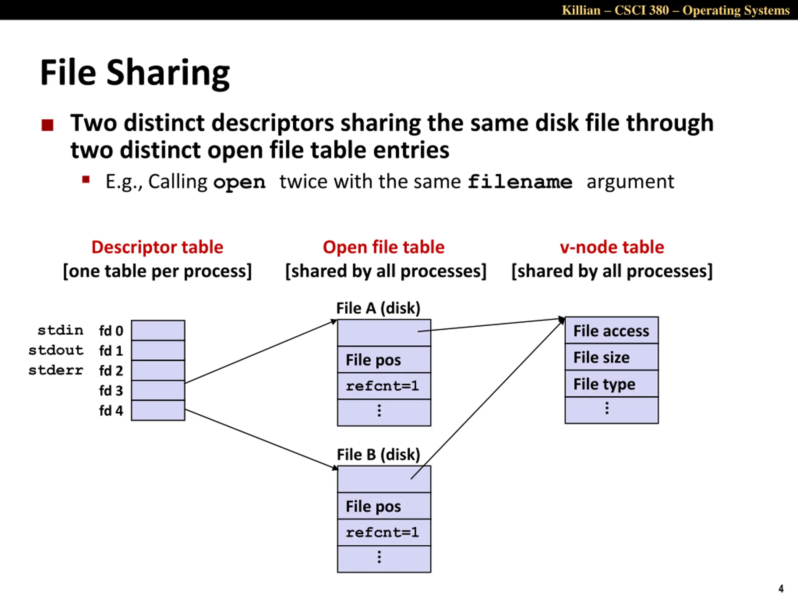 Killian CSCI 380 Operating Systems File Sharing Two distinct descriptors sharing the same disk file through two distinct open file table entries E.g., Calling opentwice with the same filenameargument Descriptor table [one table per process] Open file table [shared by all processes] v-node table [shared by all processes] File A (disk) stdin File access fd 0 fd 1 fd 2 fd 3 fd 4 stdout File size File pos refcnt=1 ... stderr File type ... File B (disk) File pos refcnt=1 ... 4