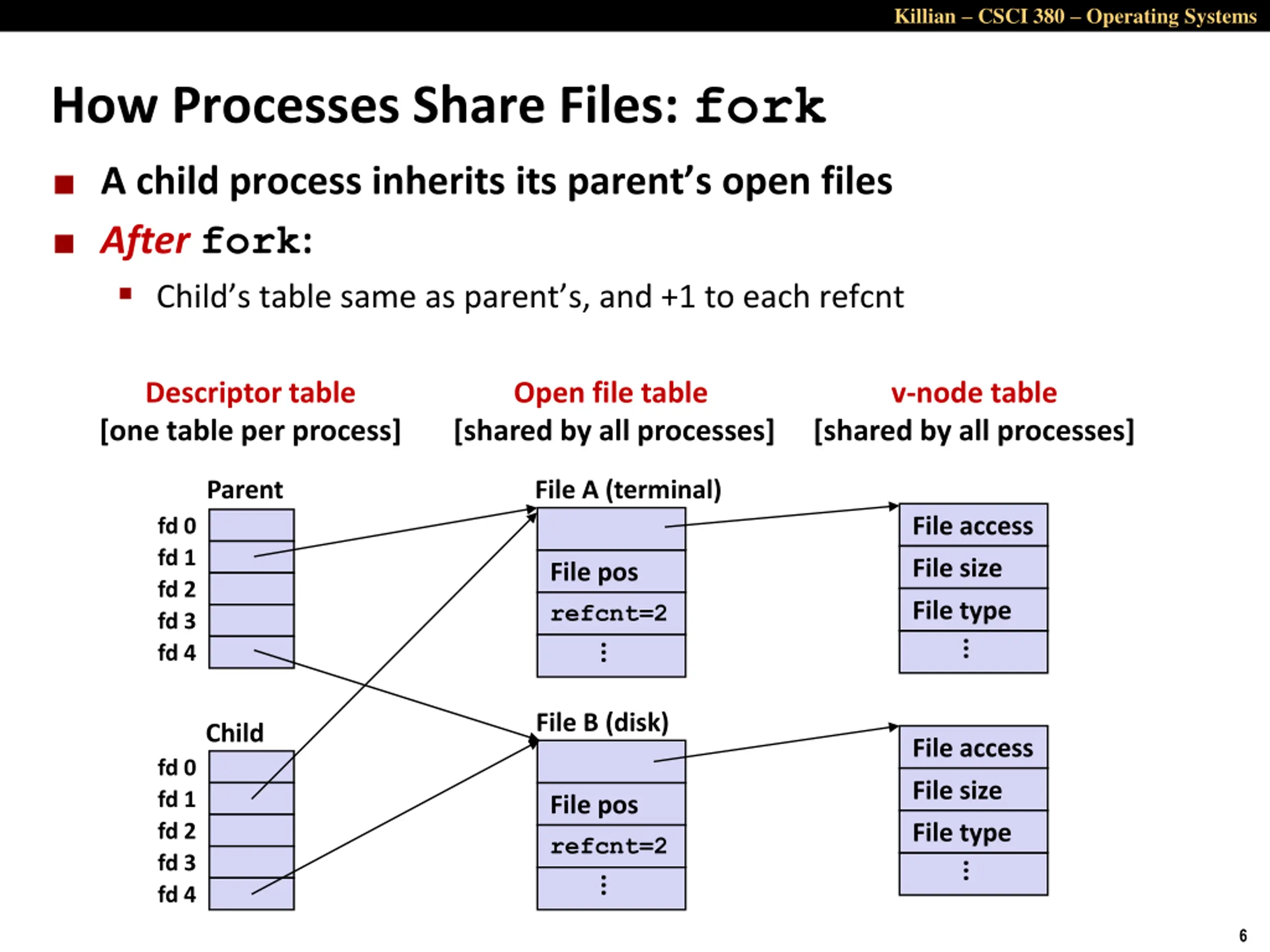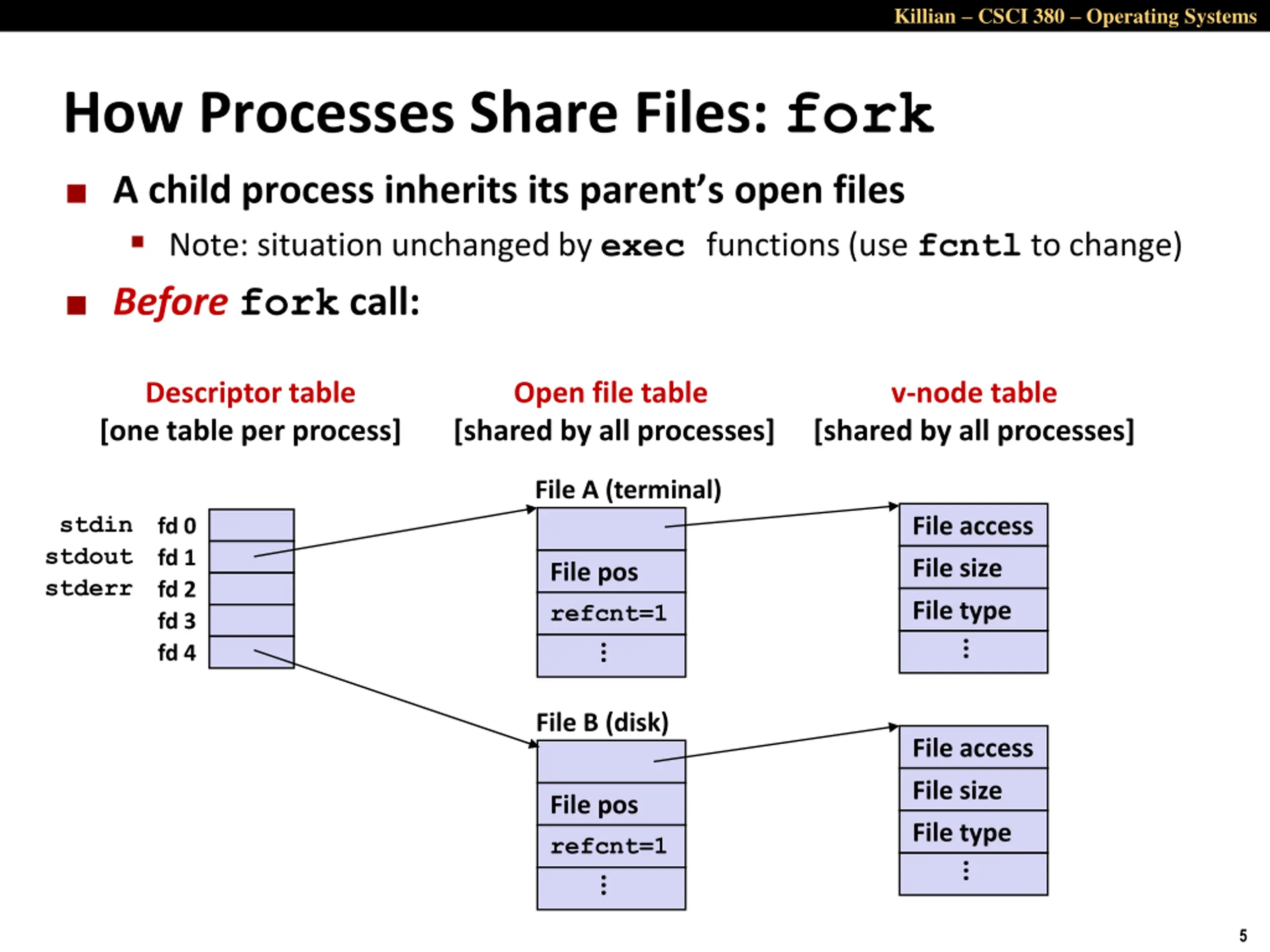 Killian CSCI 380 Operating Systems How Processes Share Files: fork A child process inherits its parent s open files Note: situation unchanged by exec functions (use fcntl to change) Beforefork call: Descriptor table [one table per process] Open file table [shared by all processes] v-node table [shared by all processes] File A (terminal) stdin File access fd 0 fd 1 fd 2 fd 3 fd 4 stdout File size File pos refcnt=1 ... stderr File type ... File B (disk) File access File size File pos refcnt=1 ... File type ... 5