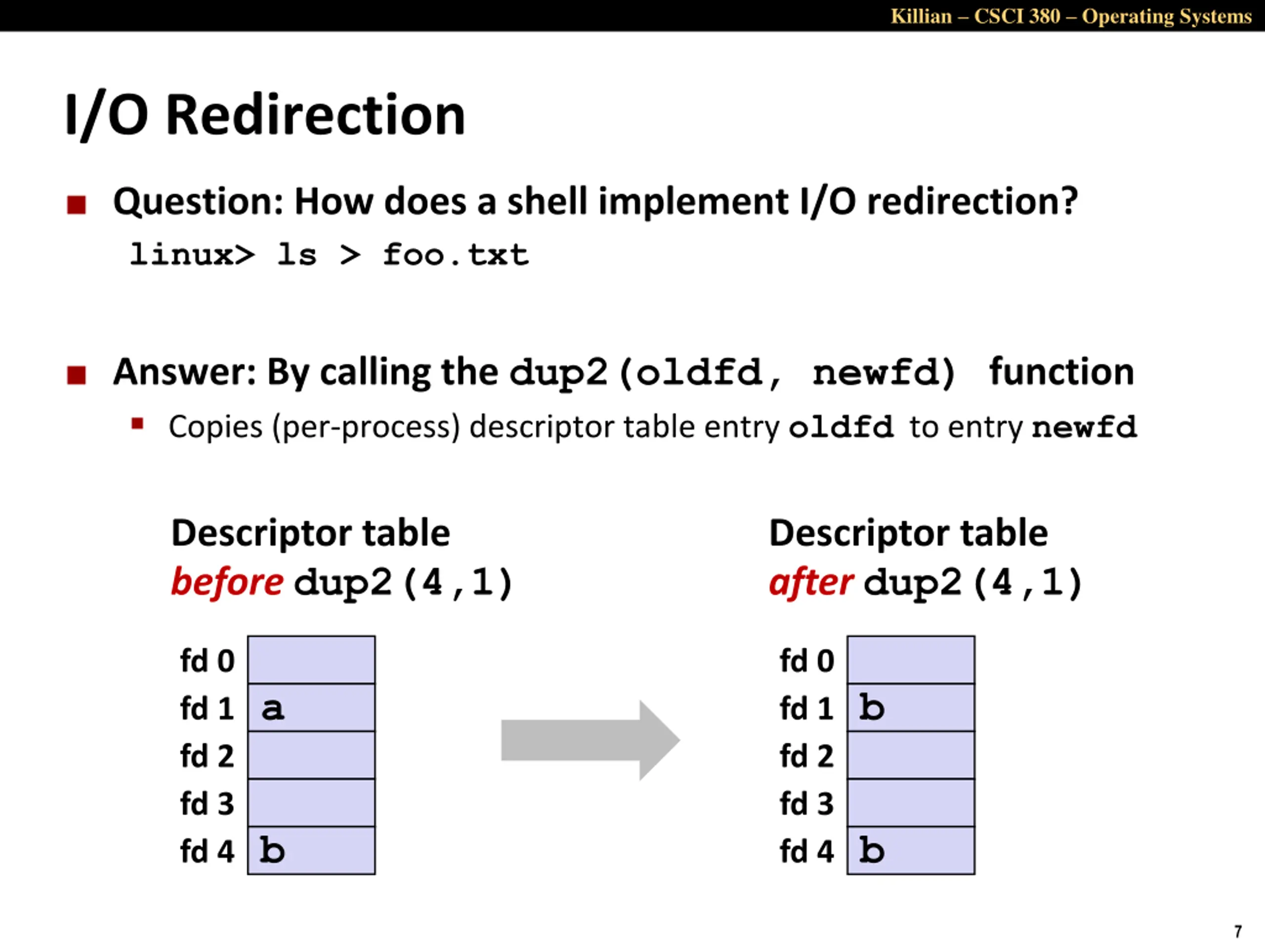 Killian CSCI 380 Operating Systems I/O Redirection Question: How does a shell implement I/O redirection? linux> ls > foo.txt Answer: By calling the dup2(oldfd, newfd) function Copies (per-process) descriptor table entry oldfd to entry newfd Descriptor table beforedup2(4,1) Descriptor table afterdup2(4,1) fd 0 fd 1 fd 2 fd 3 fd 4 fd 0 fd 1 fd 2 fd 3 fd 4 a b b b 7