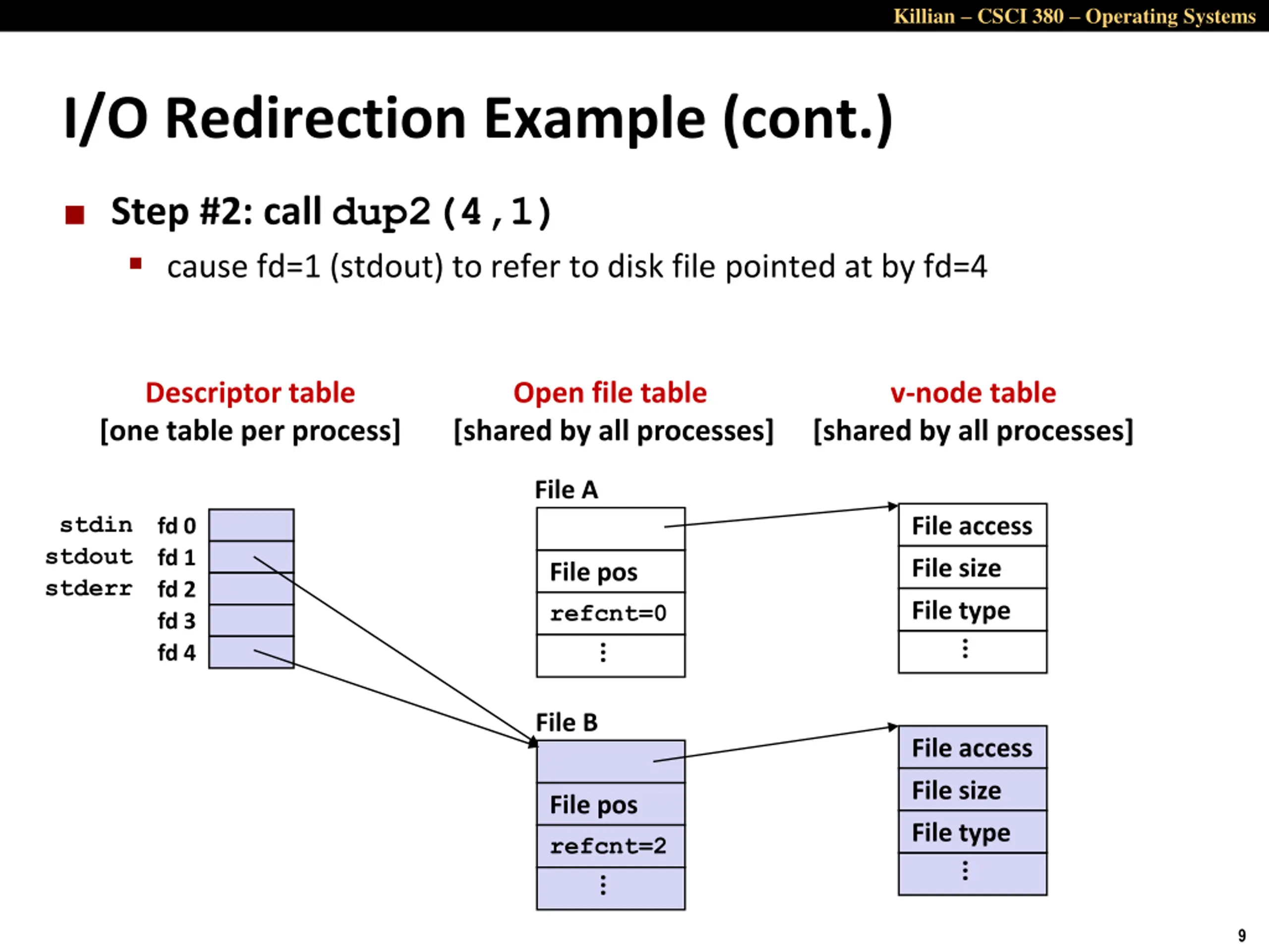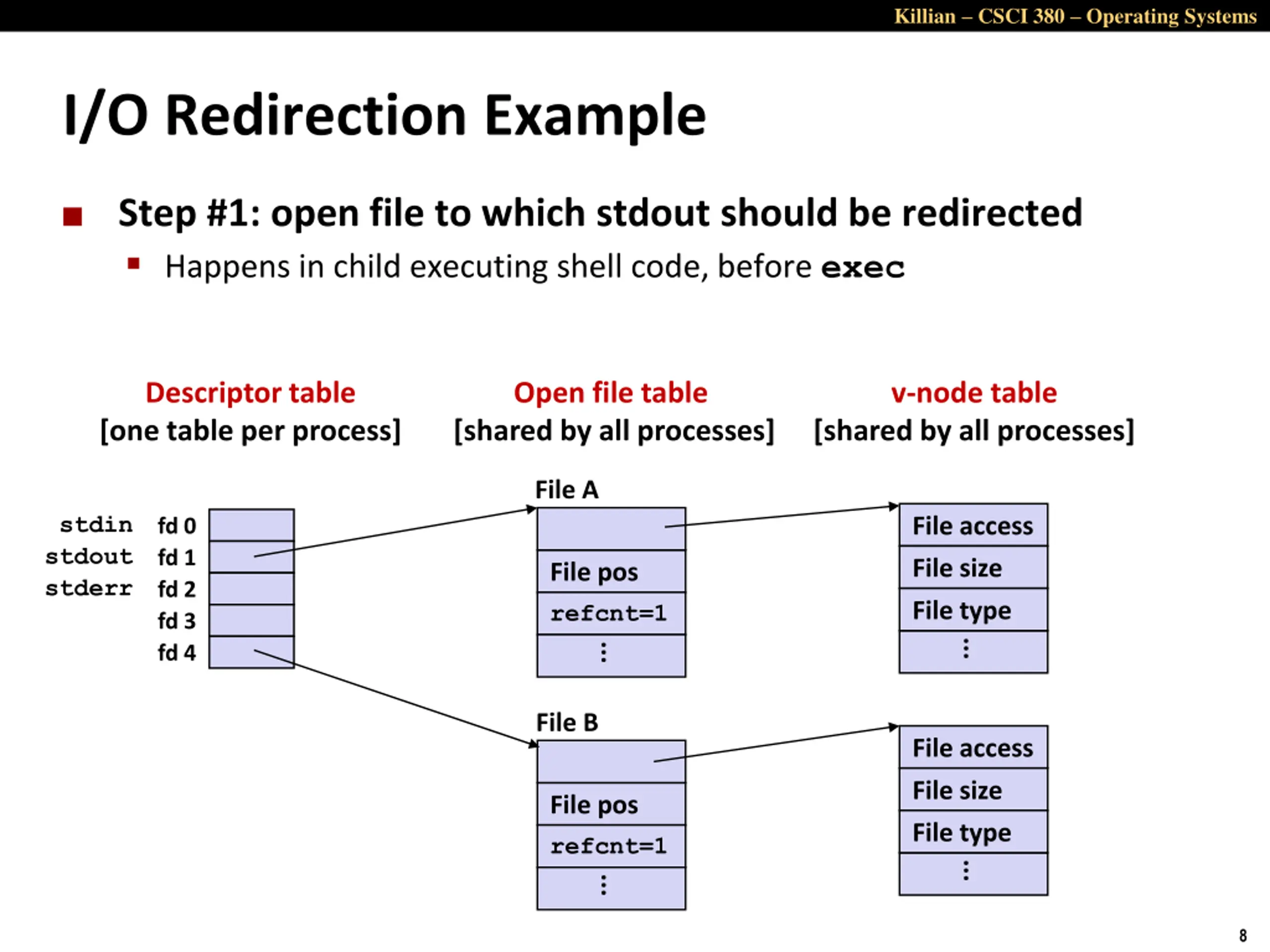 Killian CSCI 380 Operating Systems I/O Redirection Example Step #1: open file to which stdout should be redirected Happens in child executing shell code, before exec Descriptor table [one table per process] Open file table [shared by all processes] v-node table [shared by all processes] File A stdin File access fd 0 fd 1 fd 2 fd 3 fd 4 stdout File size File pos refcnt=1 ... stderr File type ... File B File access File size File pos refcnt=1 ... File type ... 8