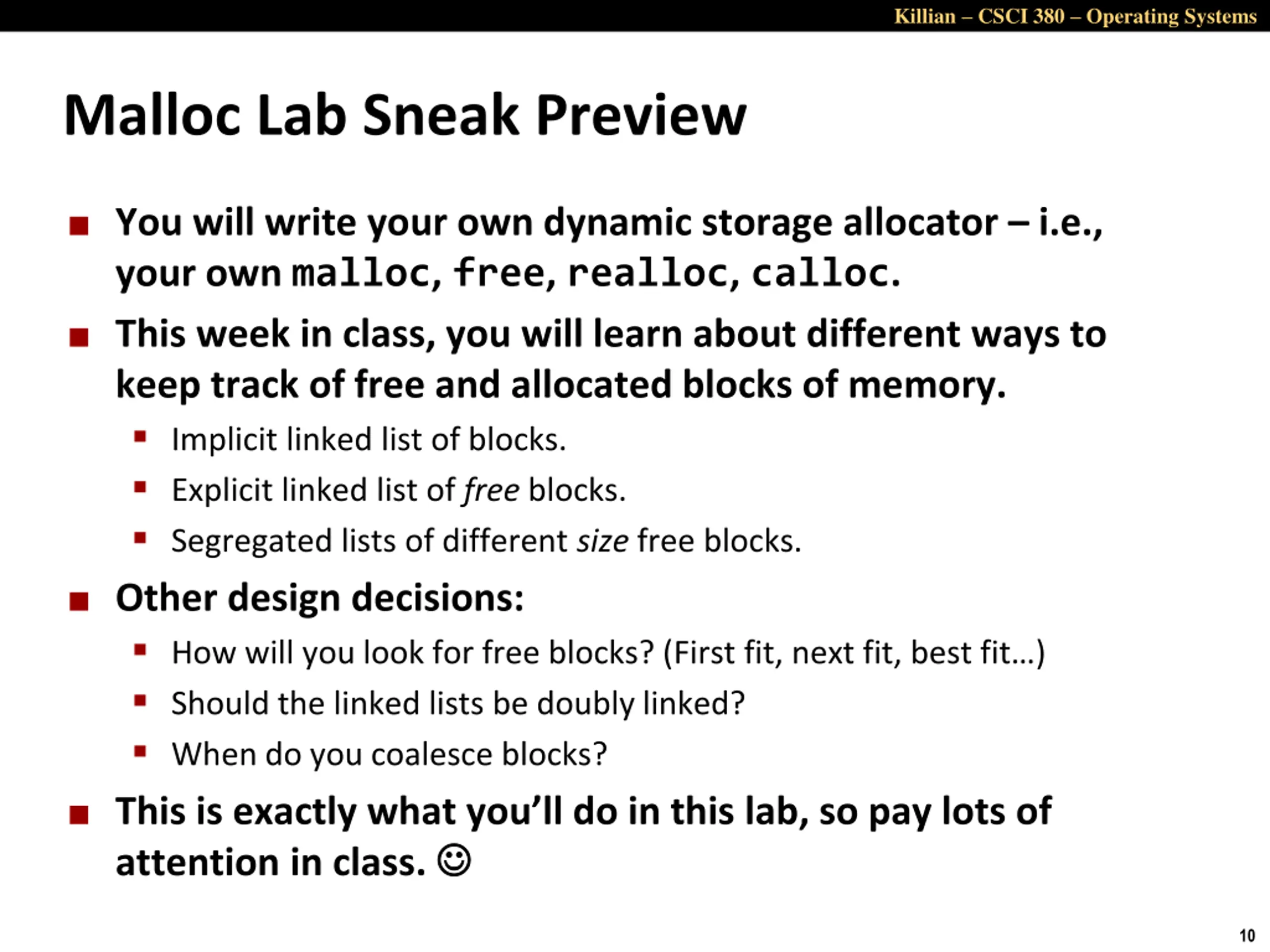 Killian CSCI 380 Operating Systems Malloc Lab Sneak Preview You will write your own dynamic storage allocator i.e., your own malloc, free, realloc, calloc. This week in class, you will learn about different ways to keep track of free and allocated blocks of memory. Implicit linked list of blocks. Explicit linked list of free blocks. Segregated lists of different size free blocks. Other design decisions: How will you look for free blocks? (First fit, next fit, best fit ) Should the linked lists be doubly linked? When do you coalesce blocks? This is exactly what you ll do in this lab, so pay lots of attention in class. 10