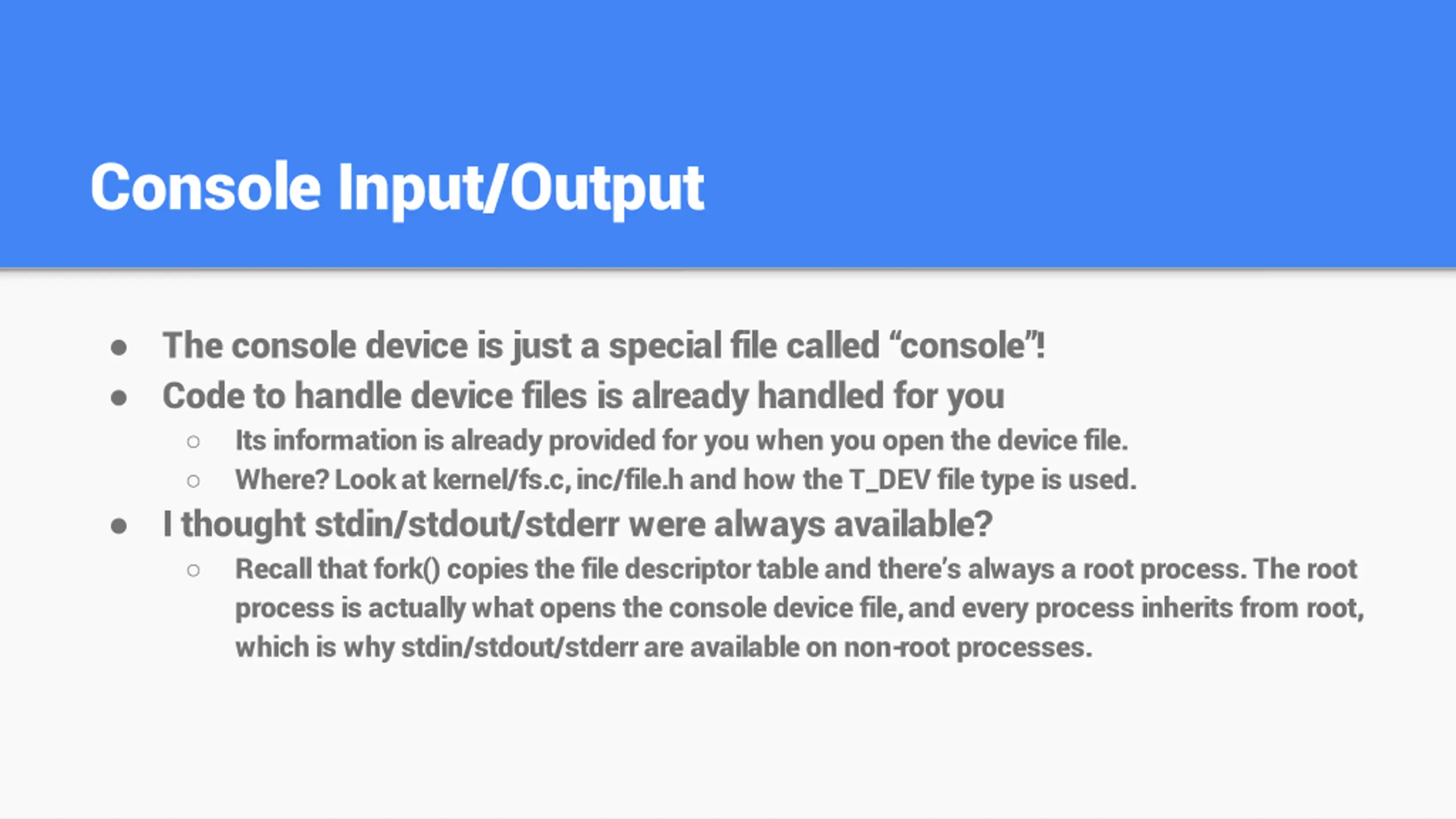 Console Input/Output The console device is just a special file called console ! Code to handle device files is already handled for you Its information is already provided for you when you open the device file. Where? Look at kernel/fs.c, inc/file.h and how the T_DEV file type is used. I thought stdin/stdout/stderr were always available? Recall that fork() copies the file descriptor table and there s always a root process. The root process is actually what opens the console device file, and every process inherits from root, which is why stdin/stdout/stderr are available on non-root processes.