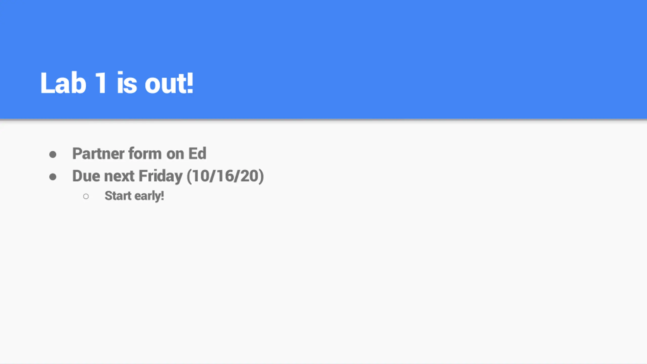 Lab 1 is out! Partner form on Ed Due next Friday (10/16/20) Start early!