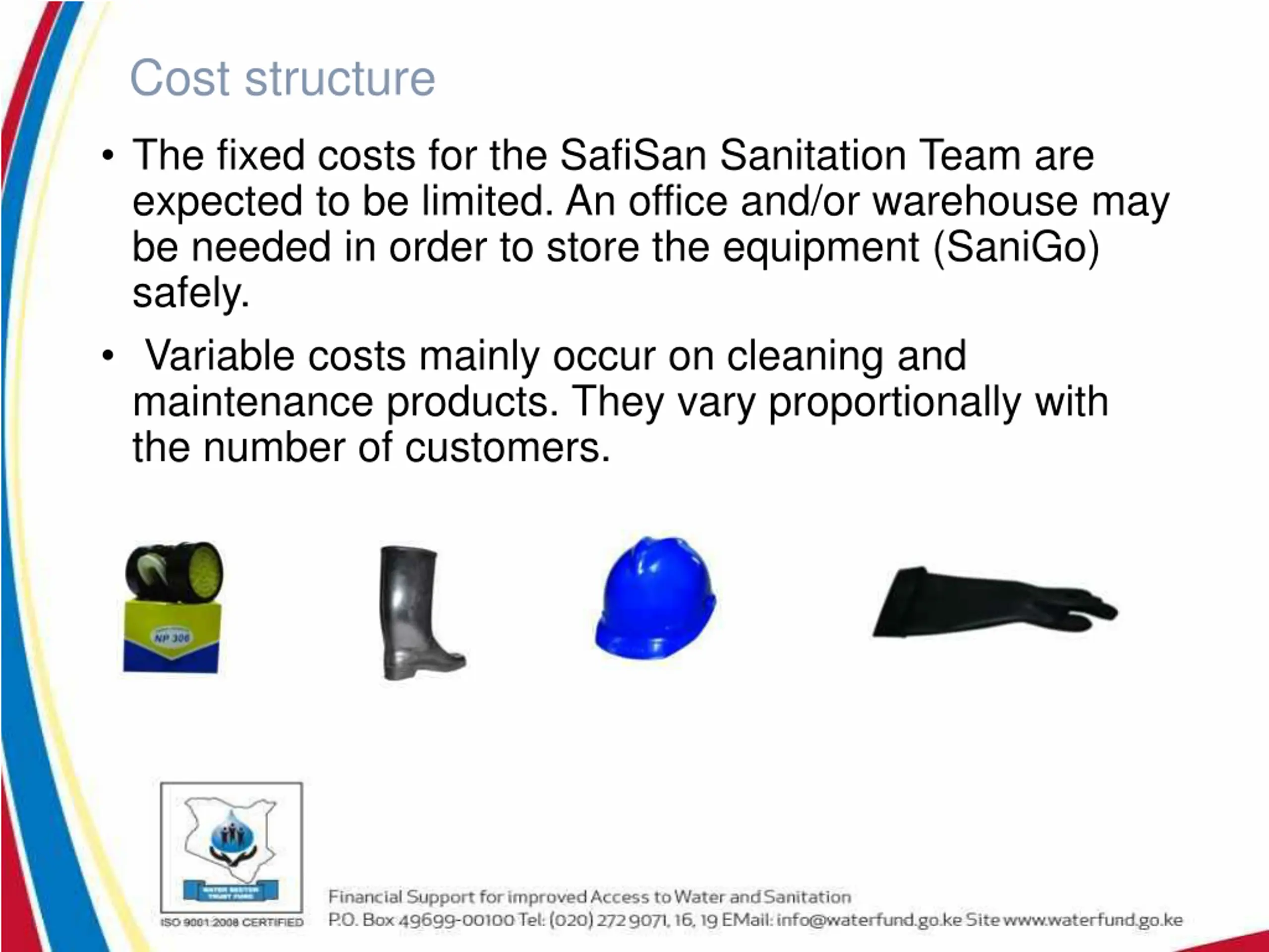 Cost structure The fixed costs for the SafiSan Sanitation Team are expected to be limited. An office and/or warehouse may be needed in order to store the equipment (SaniGo) safely. Variable costs mainly occur on cleaning and maintenance products. They vary proportionally with the number of customers.