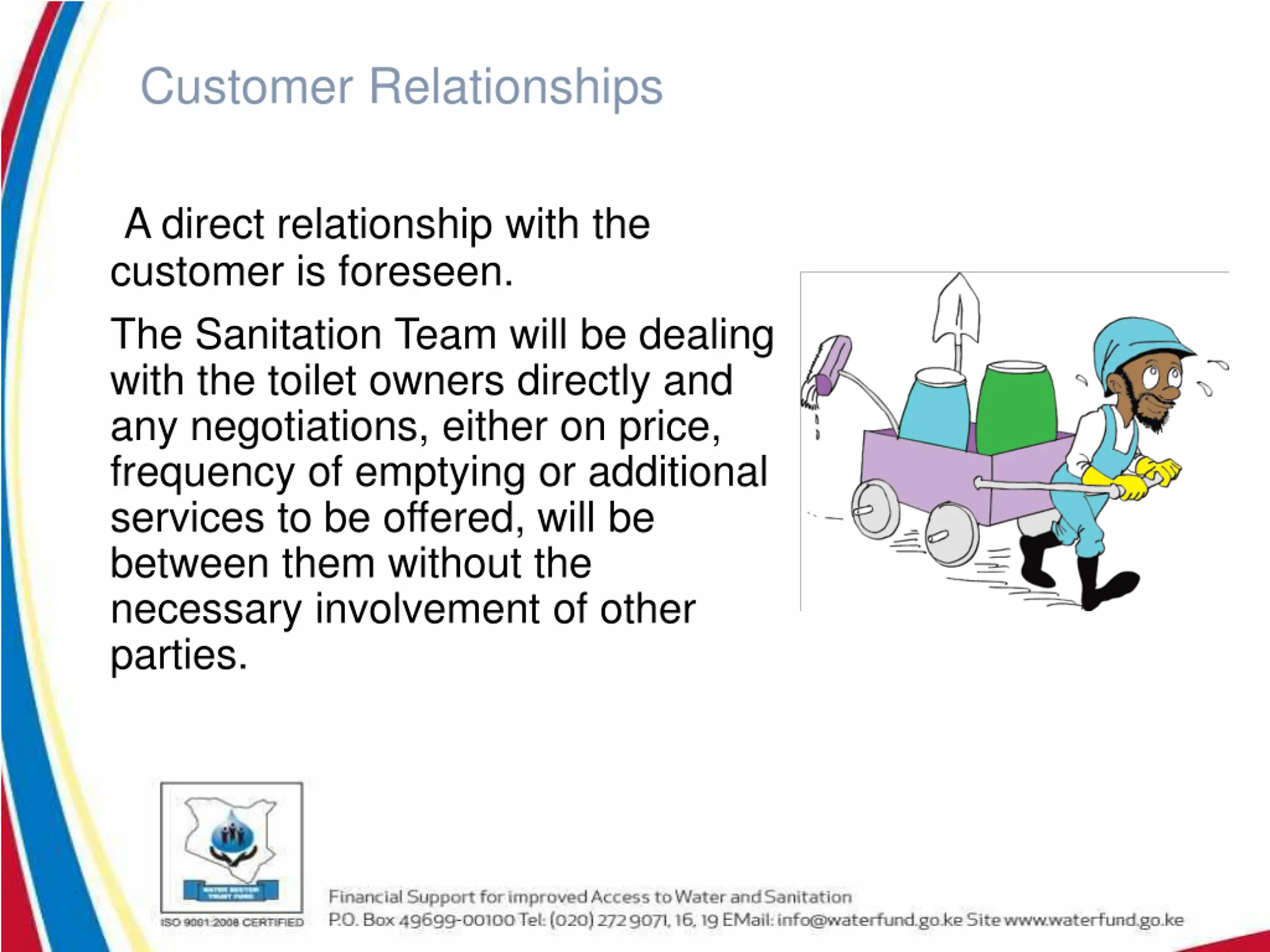 Customer Relationships A direct relationship with the customer is foreseen. The Sanitation Team will be dealing with the toilet owners directly and any negotiations, either on price, frequency of emptying or additional services to be offered, will be between them without the necessary involvement of other parties.