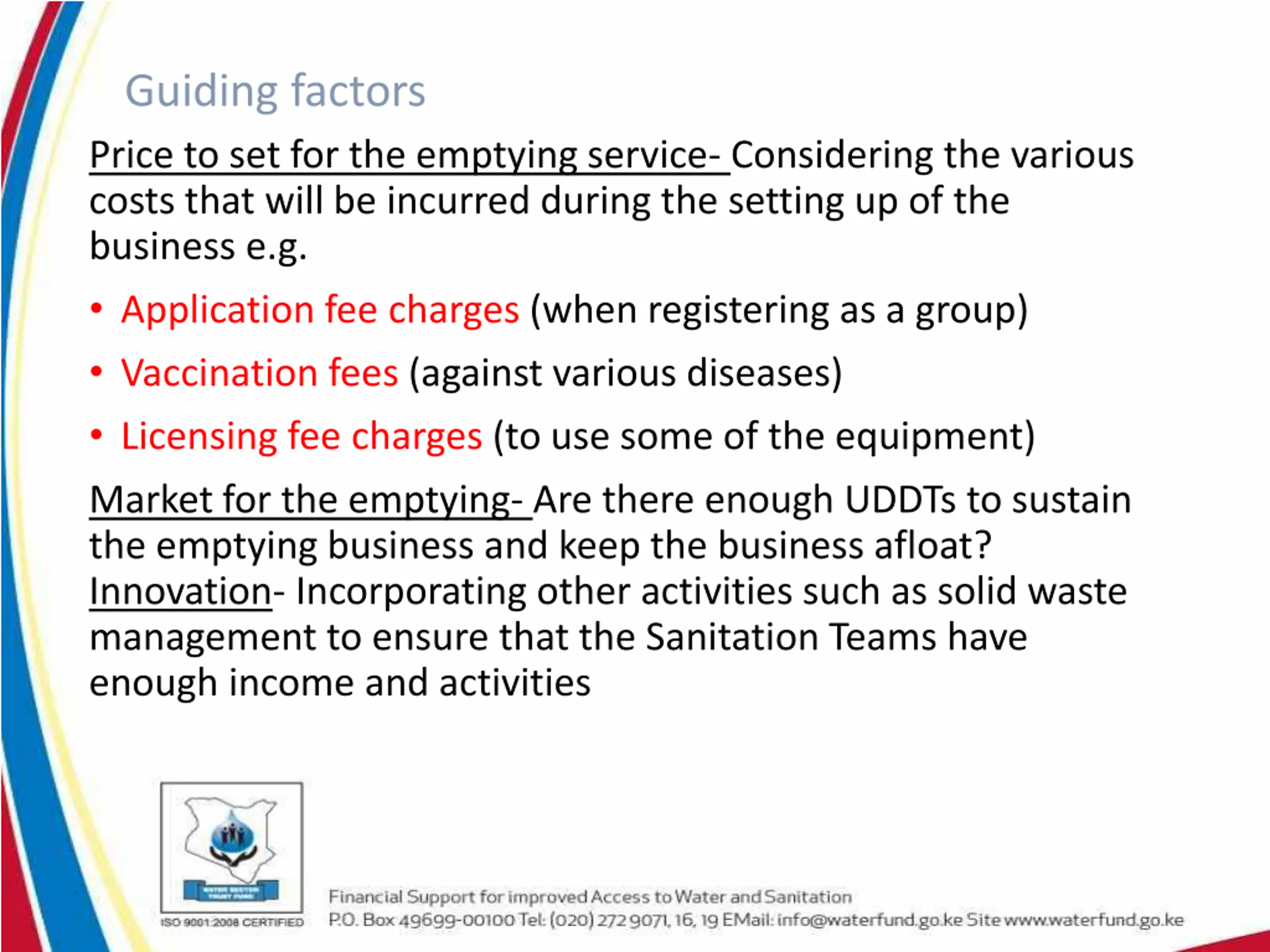 Guiding factors Price to set for the emptying service- Considering the various costs that will be incurred during the setting up of the business e.g. Application fee charges (when registering as a group) Vaccination fees (against various diseases) Licensing fee charges (to use some of the equipment) Market for the emptying- Are there enough UDDTs to sustain the emptying business and keep the business afloat? Innovation- Incorporating other activities such as solid waste management to ensure that the Sanitation Teams have enough income and activities
