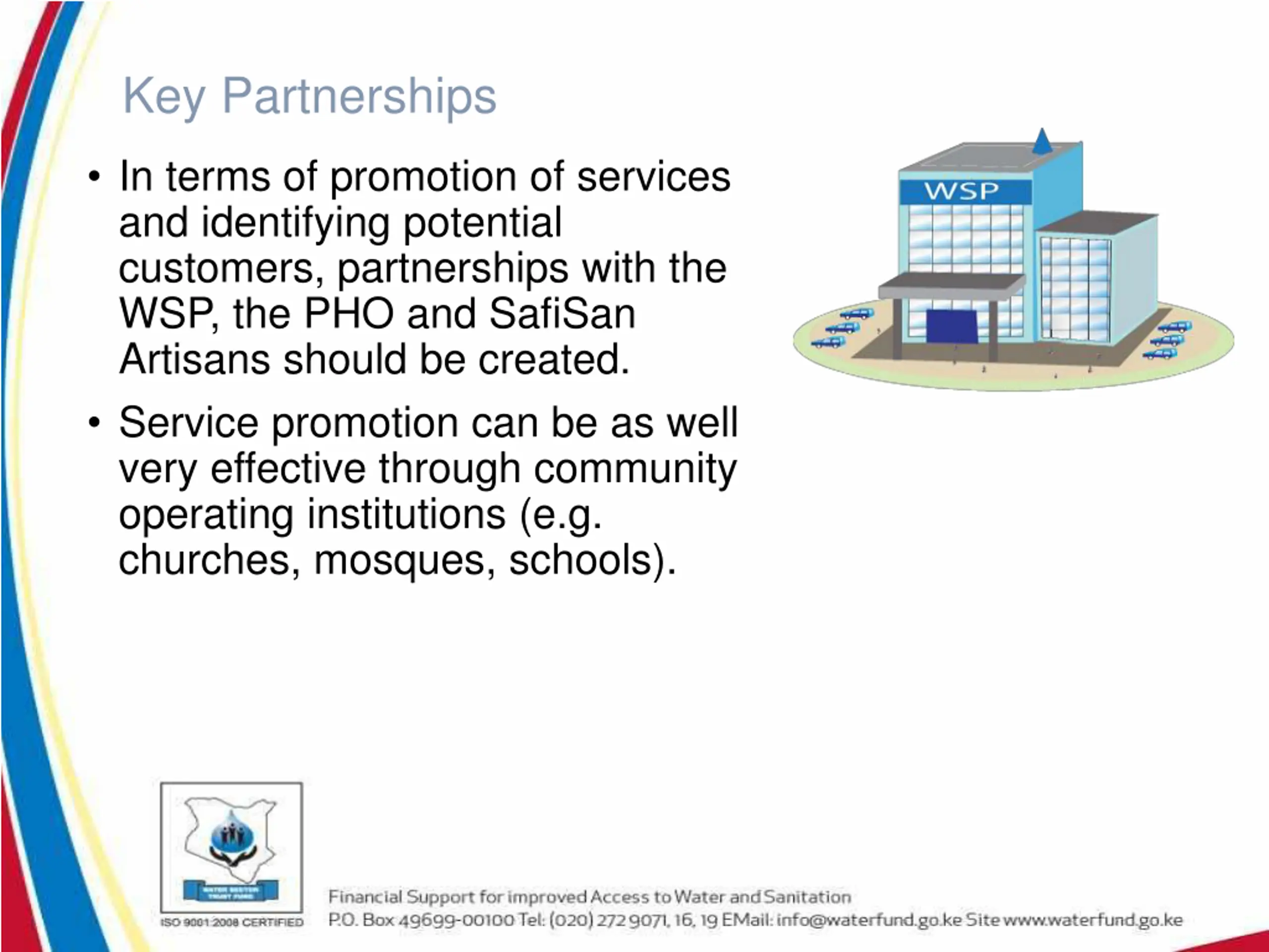 Key Partnerships In terms of promotion of services and identifying potential customers, partnerships with the WSP, the PHO and SafiSan Artisans should be created. Service promotion can be as well very effective through community operating institutions (e.g. churches, mosques, schools).