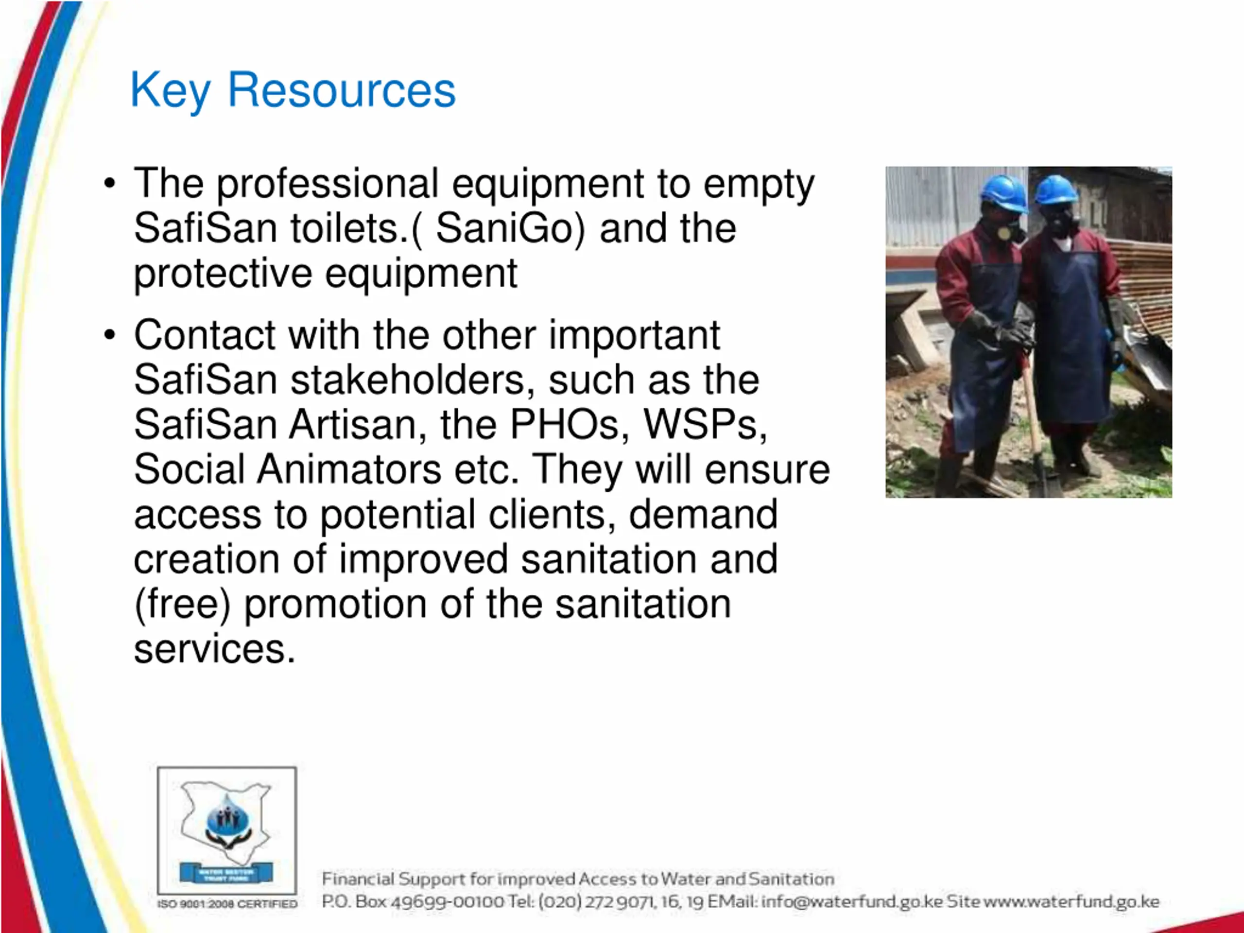 Key Resources The professional equipment to empty SafiSan toilets.( SaniGo) and the protective equipment Contact with the other important SafiSan stakeholders, such as the SafiSan Artisan, the PHOs, WSPs, Social Animators etc. They will ensure access to potential clients, demand creation of improved sanitation and (free) promotion of the sanitation services.