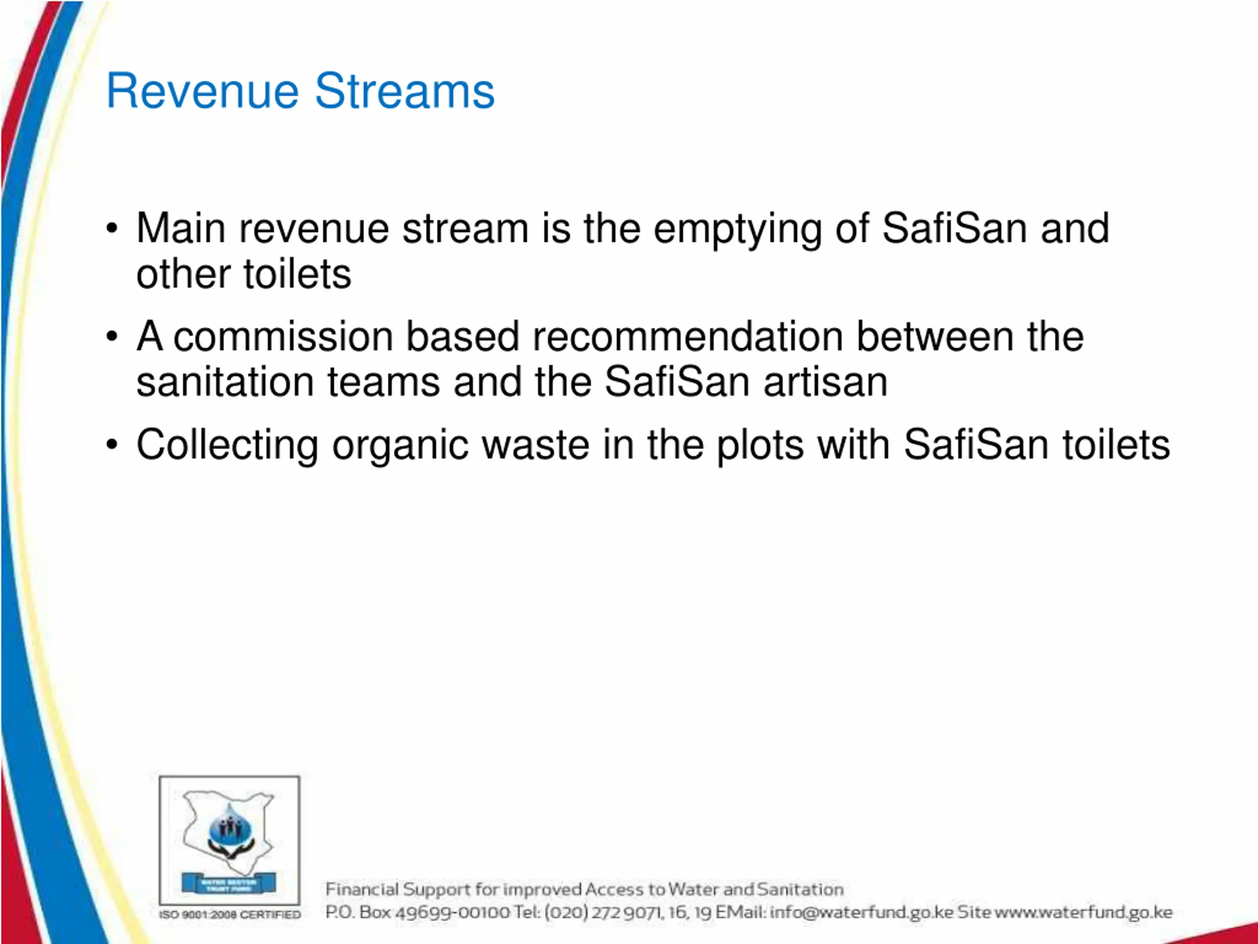Revenue Streams Main revenue stream is the emptying of SafiSan and other toilets A commission based recommendation between the sanitation teams and the SafiSan artisan Collecting organic waste in the plots with SafiSan toilets