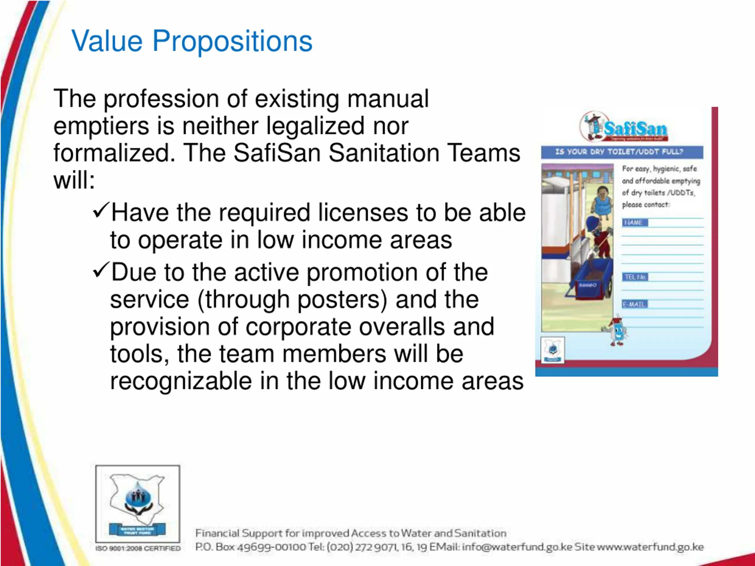 Value Propositions The profession of existing manual emptiers is neither legalized nor formalized. The SafiSan Sanitation Teams will: Have the required licenses to be able to operate in low income areas Due to the active promotion of the service (through posters) and the provision of corporate overalls and tools, the team members will be recognizable in the low income areas