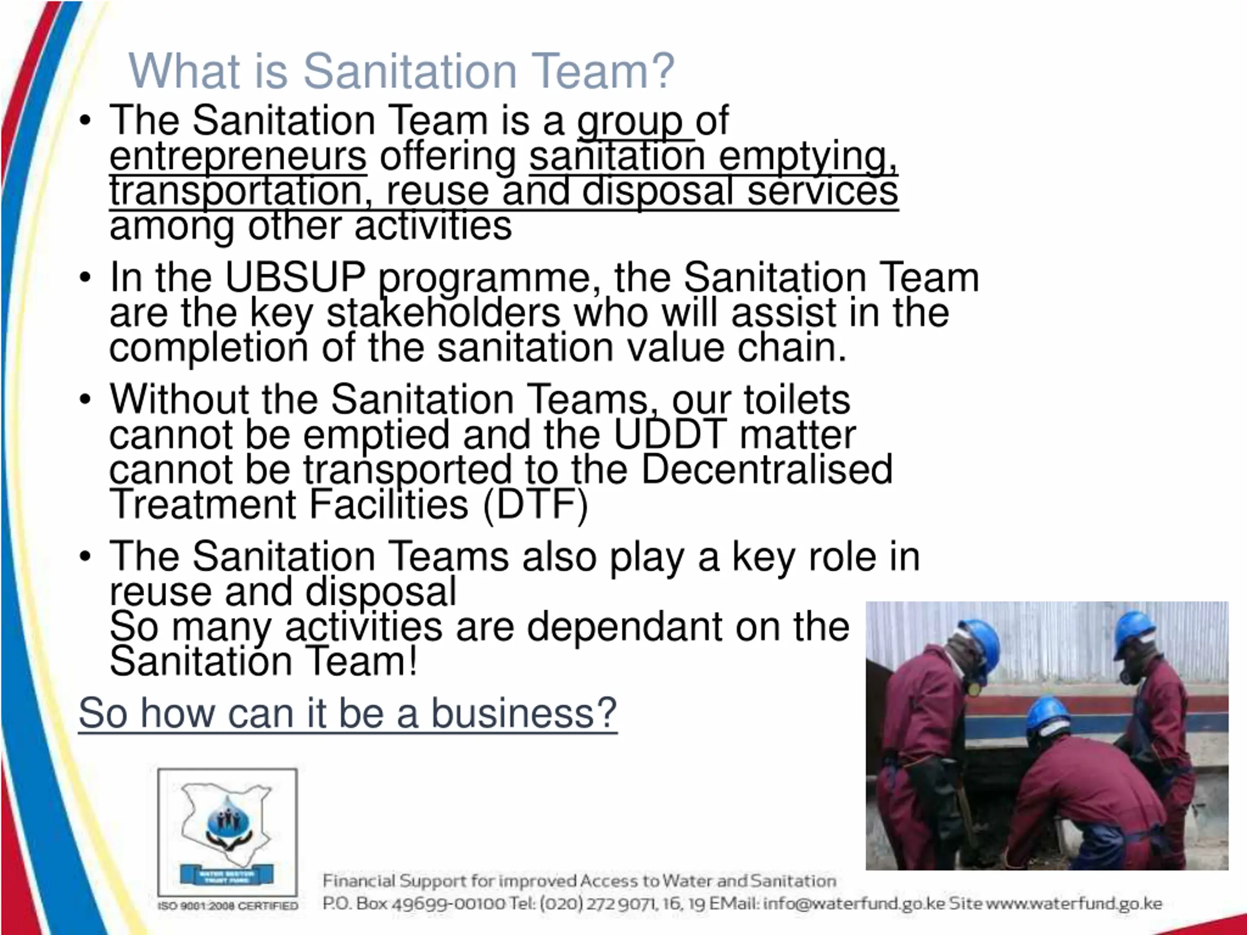 What is Sanitation Team? The Sanitation Team is a group of entrepreneurs offering sanitation emptying, transportation, reuse and disposal services among other activities In the UBSUP programme, the Sanitation Team are the key stakeholders who will assist in the completion of the sanitation value chain. Without the Sanitation Teams, our toilets cannot be emptied and the UDDT matter cannot be transported to the Decentralised Treatment Facilities (DTF) The Sanitation Teams also play a key role in reuse and disposal So many activities are dependant on the Sanitation Team! So how can it be a business?
